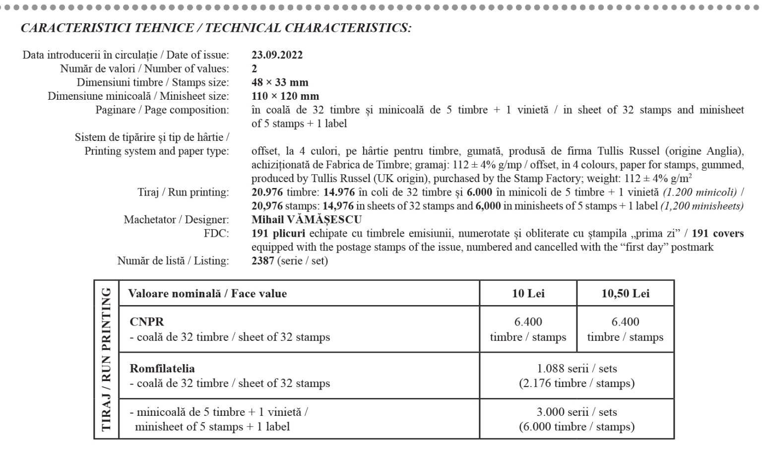 Emisiunea va fi disponibilă de vineri, 23 septembrie, în rețeaua magazinelor Romfilatelia din București, Bacău, Brașov, Cluj-Napoca, Iași, Timișoara, precum și în magazinul nostru online: https://romfilatelia.ro/store/.