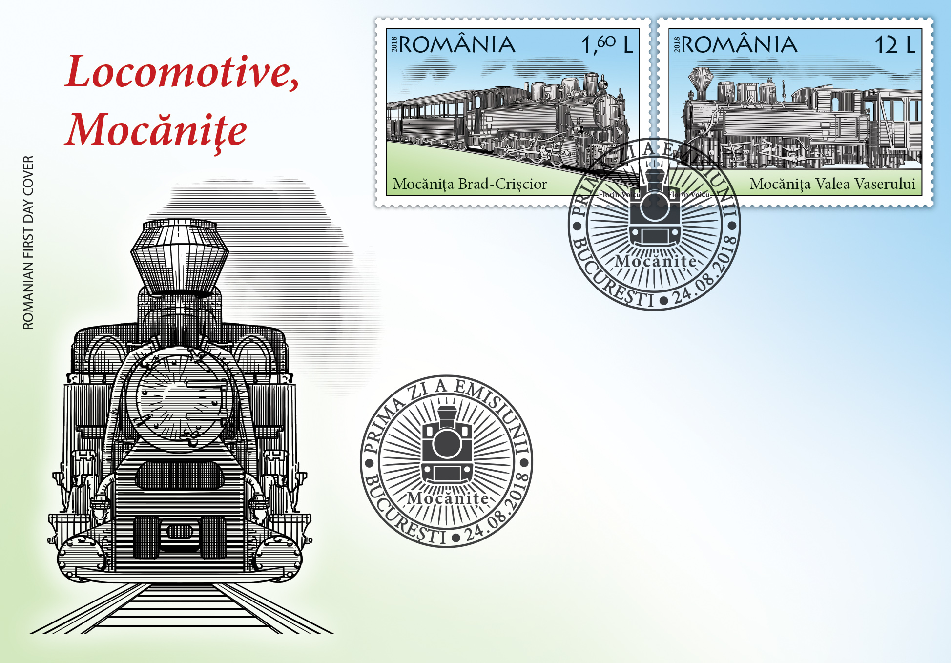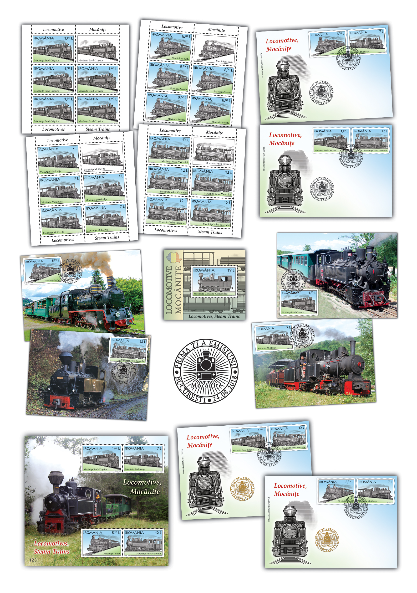 Emisiunea de mărci poștale Locomotive, Mocănițe va fi disponibilă începând de vineri, 24 august 2018, în magazinele Romfilatelia din București, Bacău, Brașov, Cluj-Napoca, Iași, Timișoara, precum și în magazinul nostru online: https://romfilatelia.ro/store/. Aceasta este completată setul de două plicuri prima zi și setul de patru cărți poștale maxime, iar ca forme de machetare au fost folosite coala de 32 de timbre (rândul 5 cu tête-bêche), minicoala de 5 timbre + 1 vinietă, blocul de 4 timbre și colița dantelată.