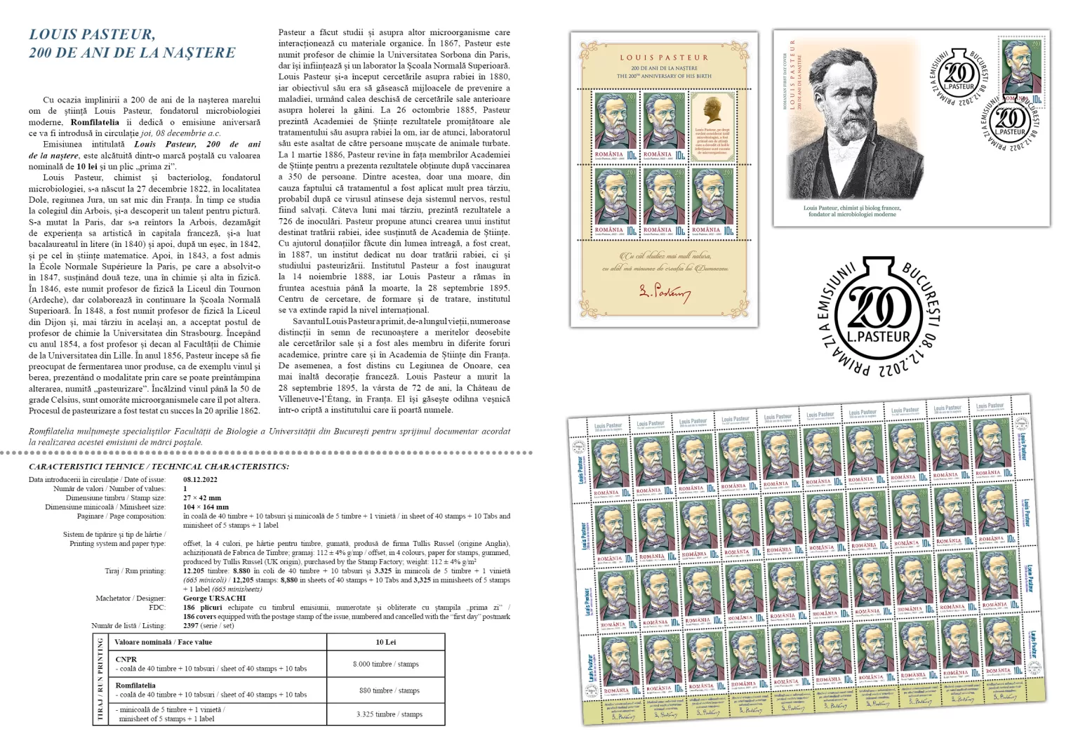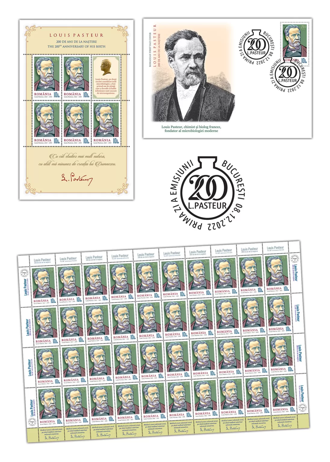 Considerând rolul mărcii poştale ca un element cu valoare de simbol prin care se pot transimte cu uşurinţă şi rapiditate mesaje care ajung la public într-o manieră creativă şi mereu originală, Romfilatelia introduce în circulaţie joi, 8 decembrie a.c. emisiunea aniversară dedicată lui Louis Pasteur la 200 de ani de la naştere.