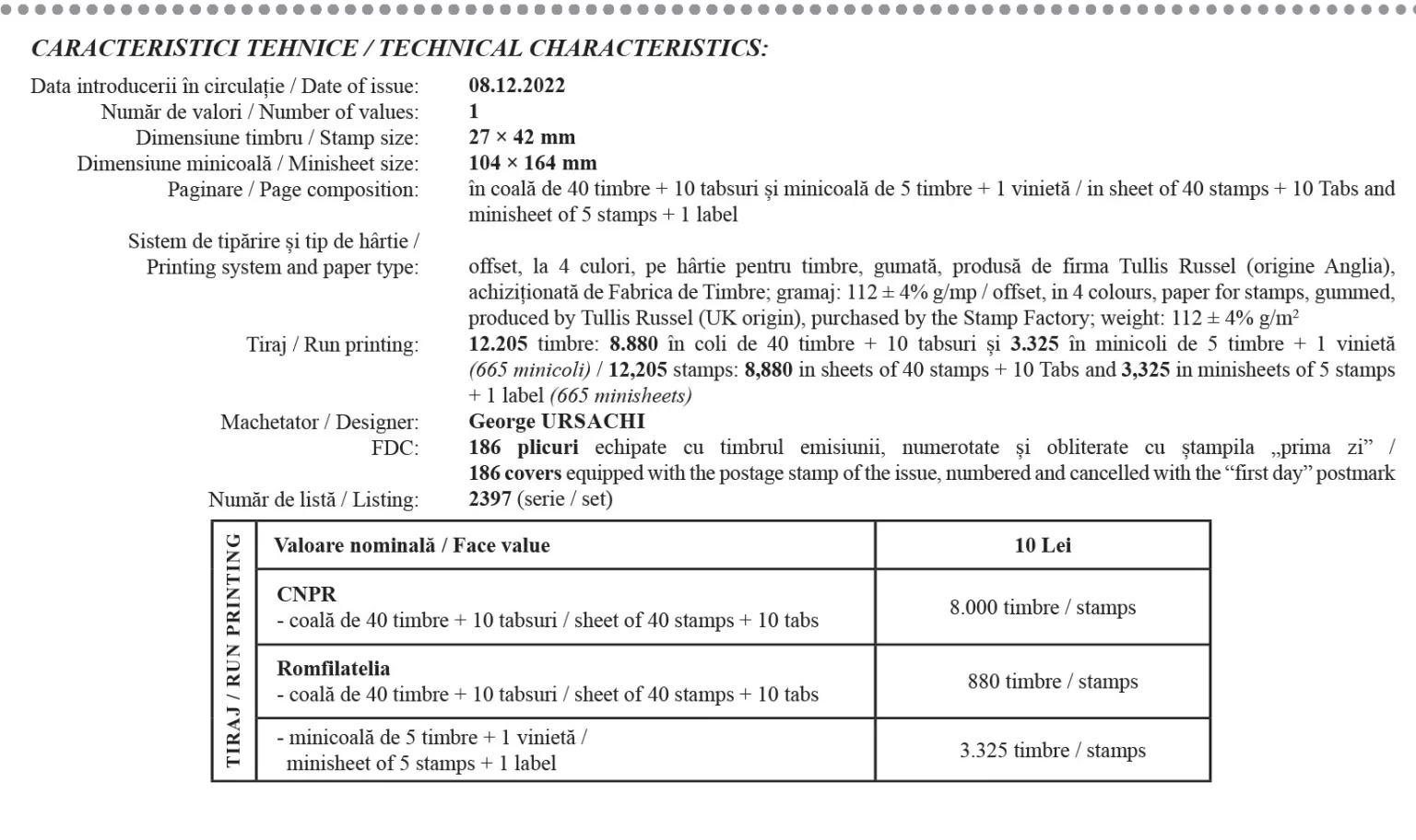 Emisiunea va fi disponibilă de joi, 08 decembrie, în rețeaua magazinelor Romfilatelia din București, Bacău, Brașov, Cluj-Napoca, Iași, Timișoara, precum și în magazinul nostru online: https://romfilatelia.ro/store/.
