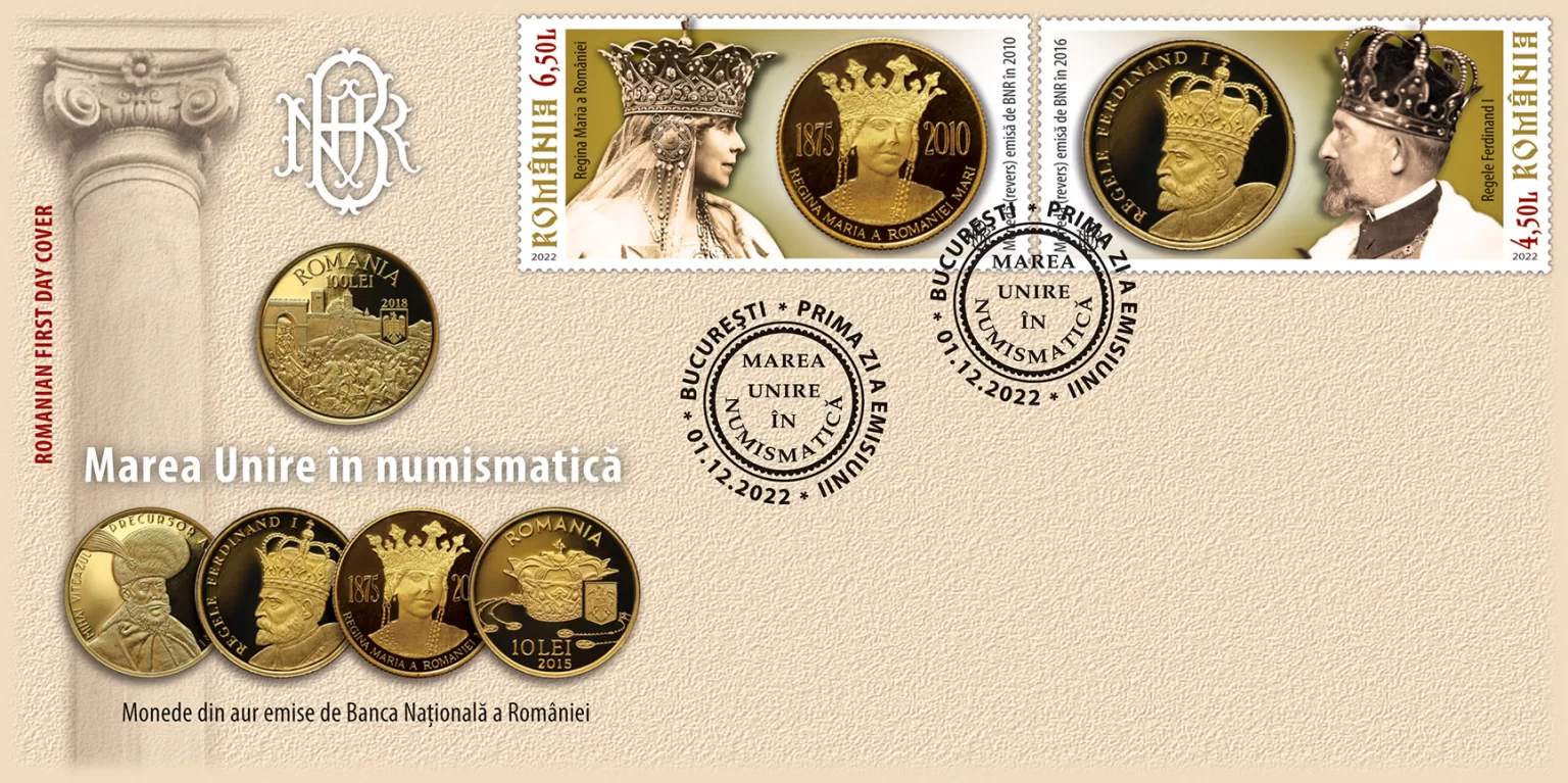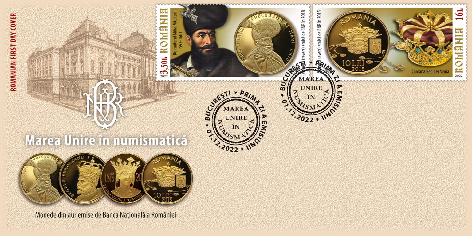 Cu prilejul zilei naţionale a României, Romfilatelia lansează joi, 1 Decembrie 2022, emisiunea filatelică Marea Unire în numismatică. Pentru a marca acest eveniment de o însemnătate crucială în viaţa ţării, au fost alese patru monede din tezaurul Băncii Naţionale a României care spun povestea întregirii neamului, de la 1601 la 1918.
