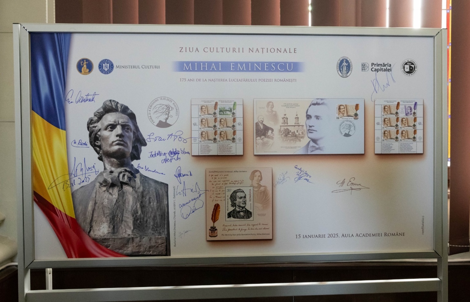 Romfilatelia, partener instituțional al Academiei Române, a fost invitată să lanseze emisiunea de mărci poștale „Luceafărul poeziei românești, Mihai Eminescu“, în Aula acestui for de cultură de prim rang.