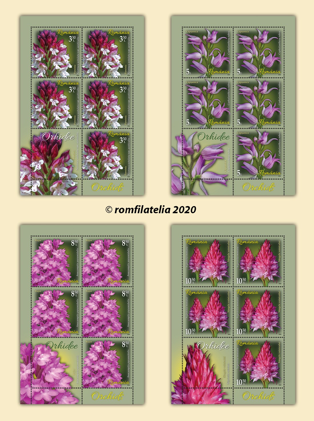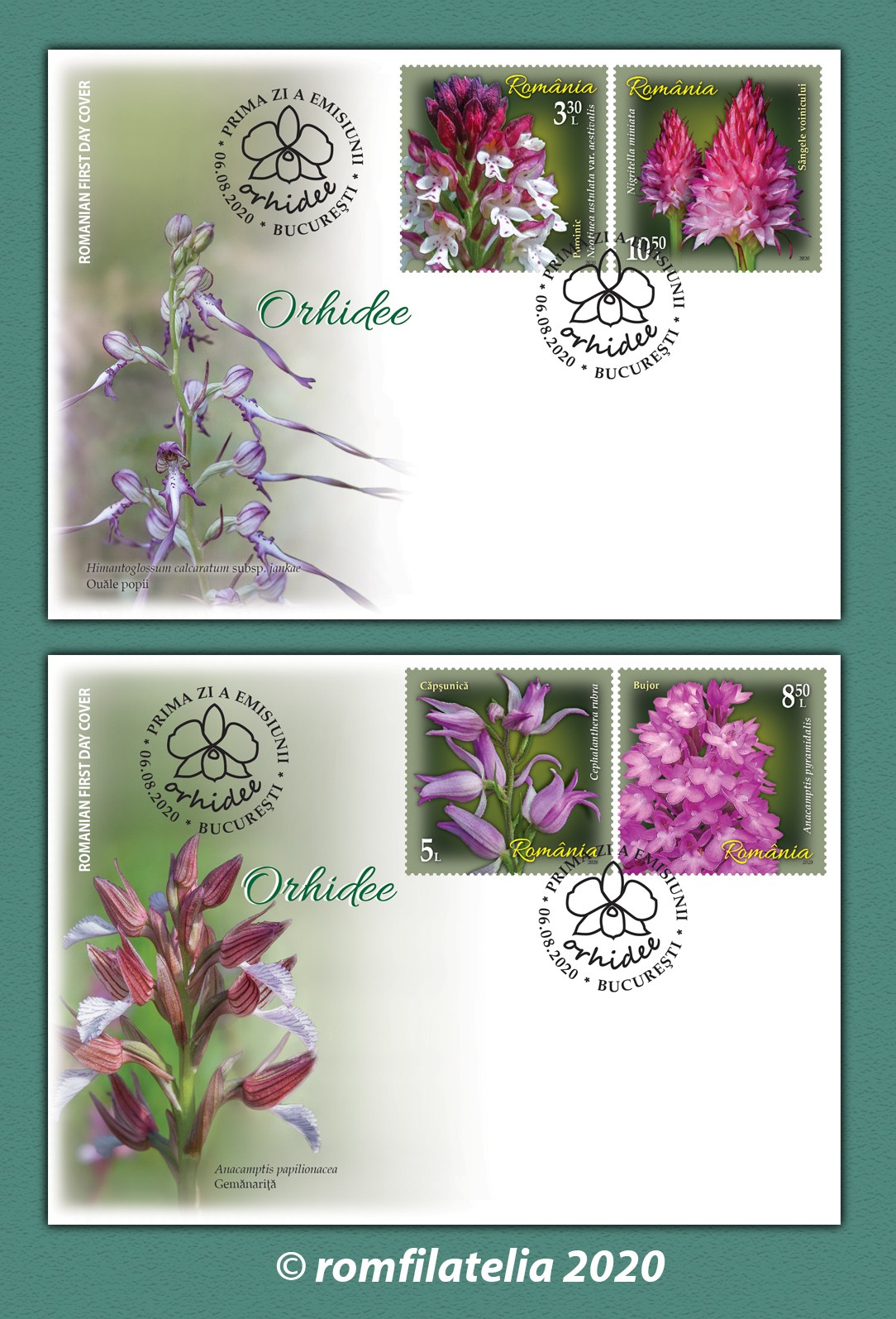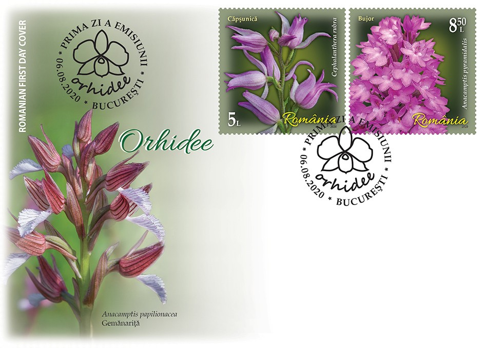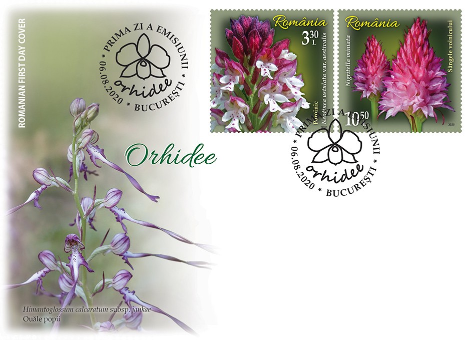 Pe setul de două plicuri „prima zi” sunt reprezentate specia Himantoglossum calcaratum subsp. jankae (Somlyay, Kreutz & Óvári) R.M. Bateman, Molnar & Sramkó – cunoscută popular ca Ouăle popii și specia Anacamptis papilionacea (L.) R.M. Bateman,Pridgeon & M.W. Chase – denumită popular Gemănariță.