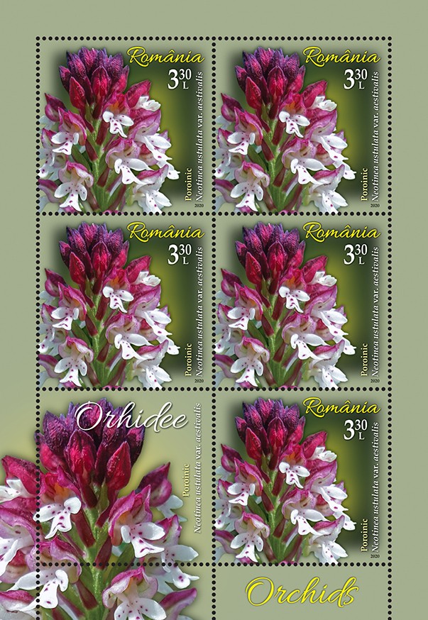 Pe timbrul cu valoarea nominală de 3,30 lei este ilustrată Neotinea ustulata var. aestivalis (Kümpel) Tali, M.F. Fay & R.M. Bateman – denumită popular Poroinic.