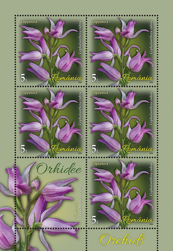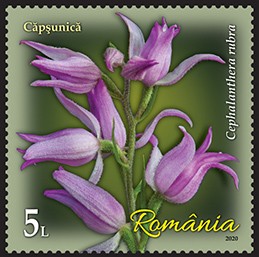 Cephalanthera rubra (L.) Rich., denumită popular Căpșunică, este reprezentată pe timbrul cu valoarea nominală de 5 lei.