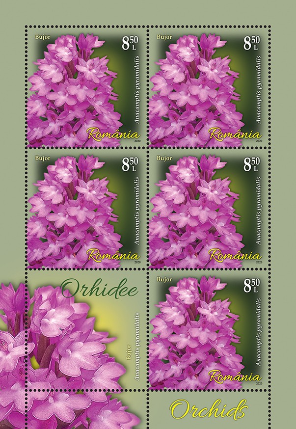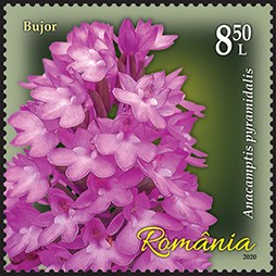 Pe timbrul cu valoarea nominală de 8,50 lei este reprodusă Anacamptis pyramidalis (L.) Rich., cunoscută popular cu denumirea Bujor.