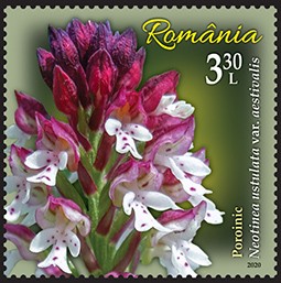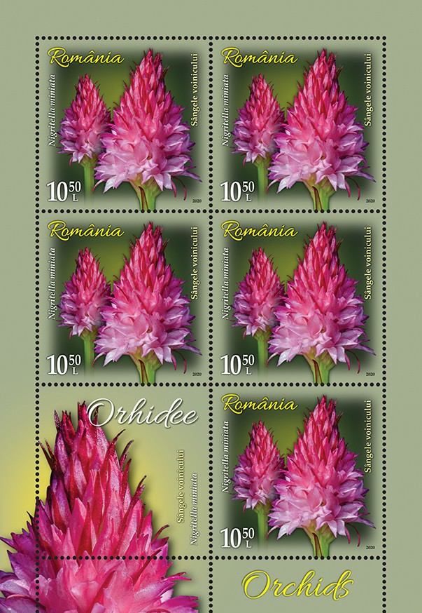 Nigritella miniata (Crantz) Janch., cunoscută popular cu denumirea Sângele voinicului este ilustrată pe timbrul cu valoarea nominală de 10,50 lei.
