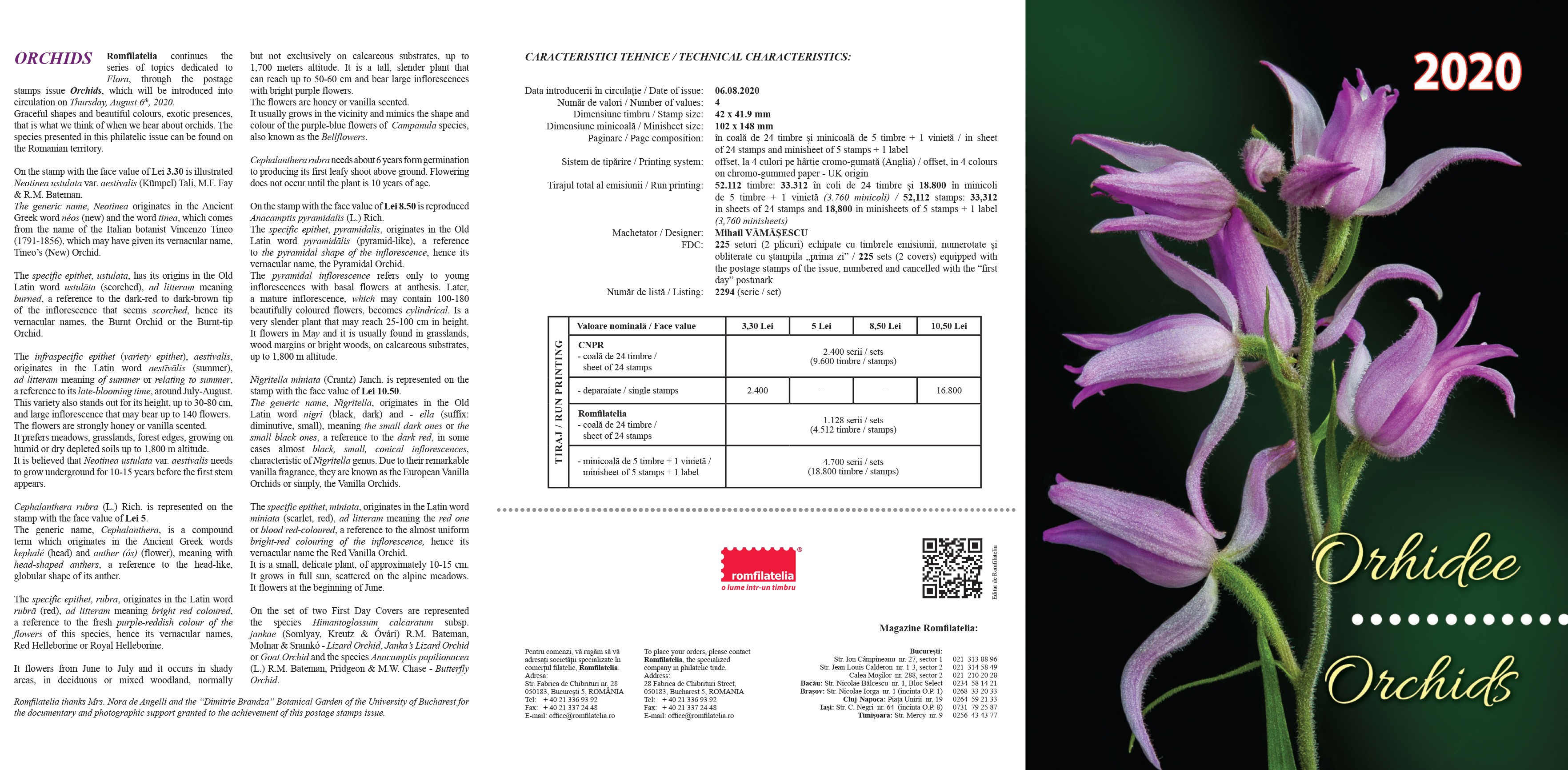 Emisiunea de mărci poștale Orhidee va fi disponibilă începând de joi, 6 august 2020, în magazinele Romfilatelia din București, Bacău, Brașov, Cluj-Napoca, Iași, Timișoara, precum și în magazinul nostru online: https://romfilatelia.ro/store/. Aceasta este completată de cele 2 plicuri „prima zi”, în coală de 24 timbre și minicoală de 5 timbre + 1 vinietă.