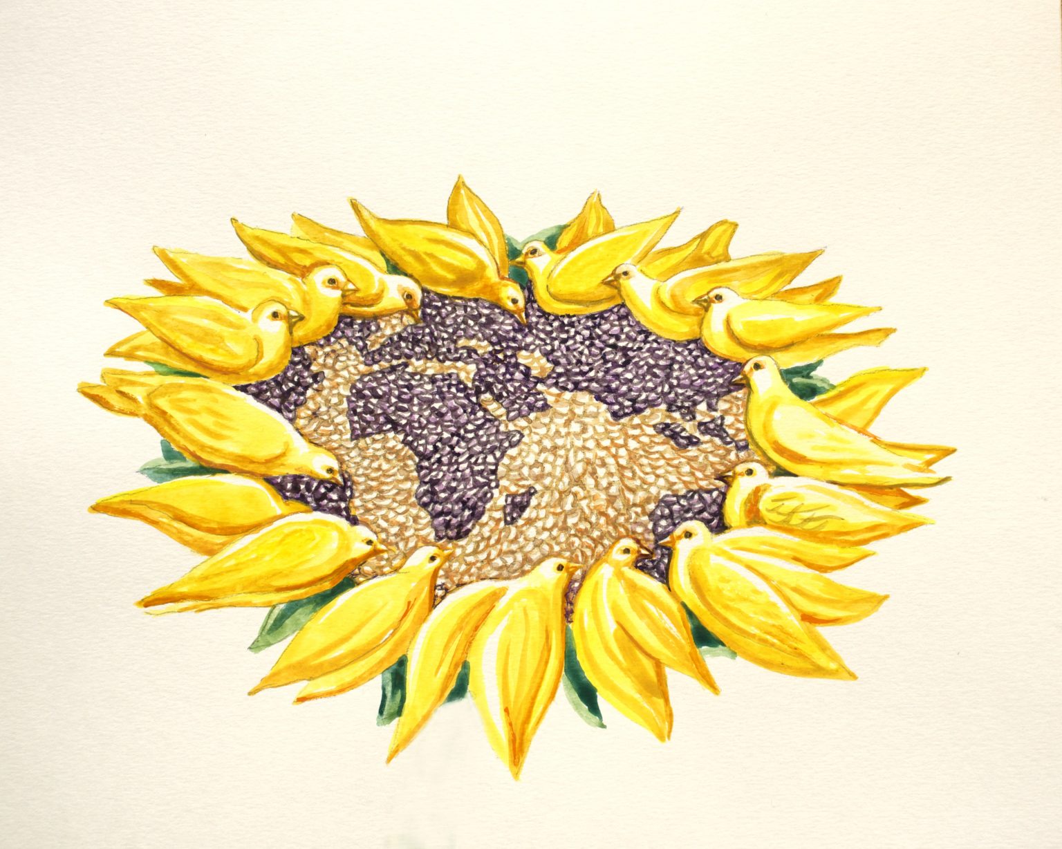 „În macheta prezentată de mine am redat floarea soarelui ca simbol Flower Power, simbol al păcii reprezentând mișcarea pacifistă din anii ’69 ca protest împotriva războiului din Vietnam şi porumbelul alb ca simbol al păcii. De data aceasta petalele galbene ale florii soarelui sunt personificate în porumbei care ciugulesc seminţe din interiorul florii ce se transformă în continente.”