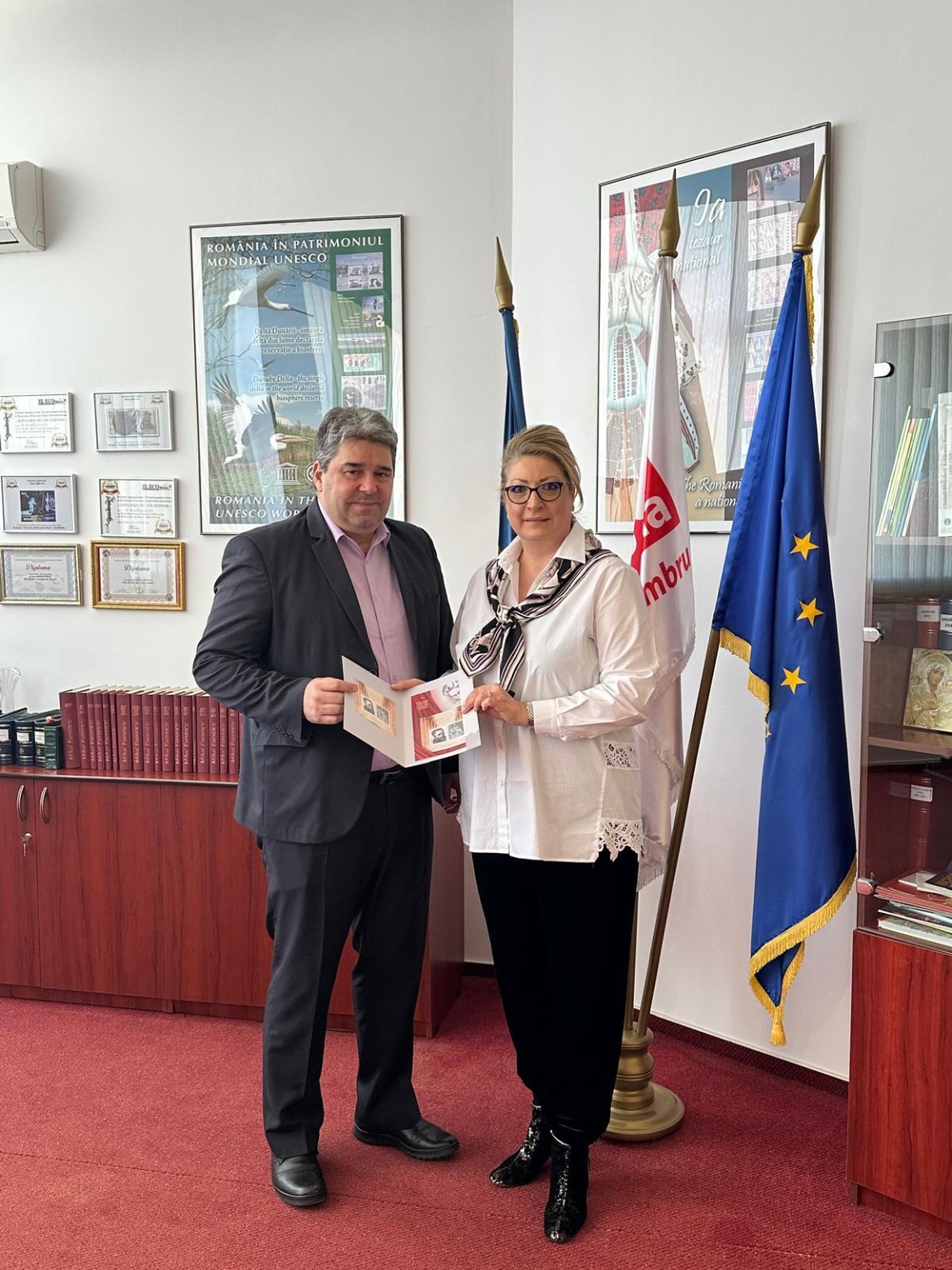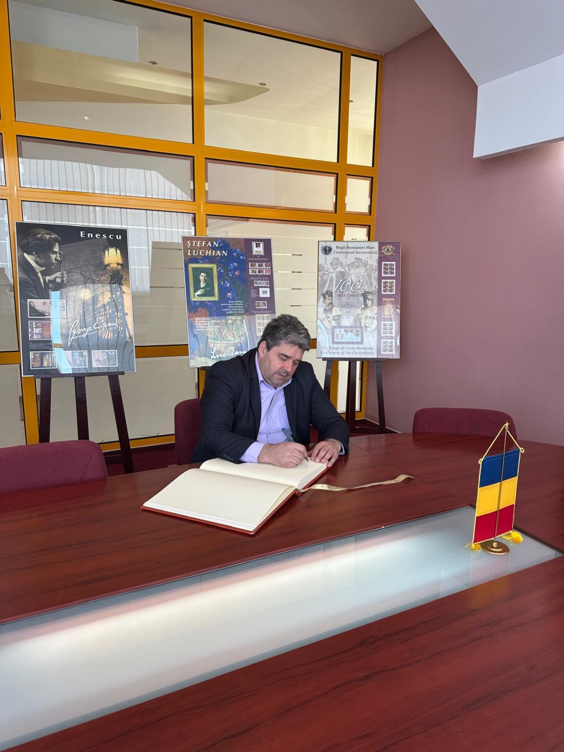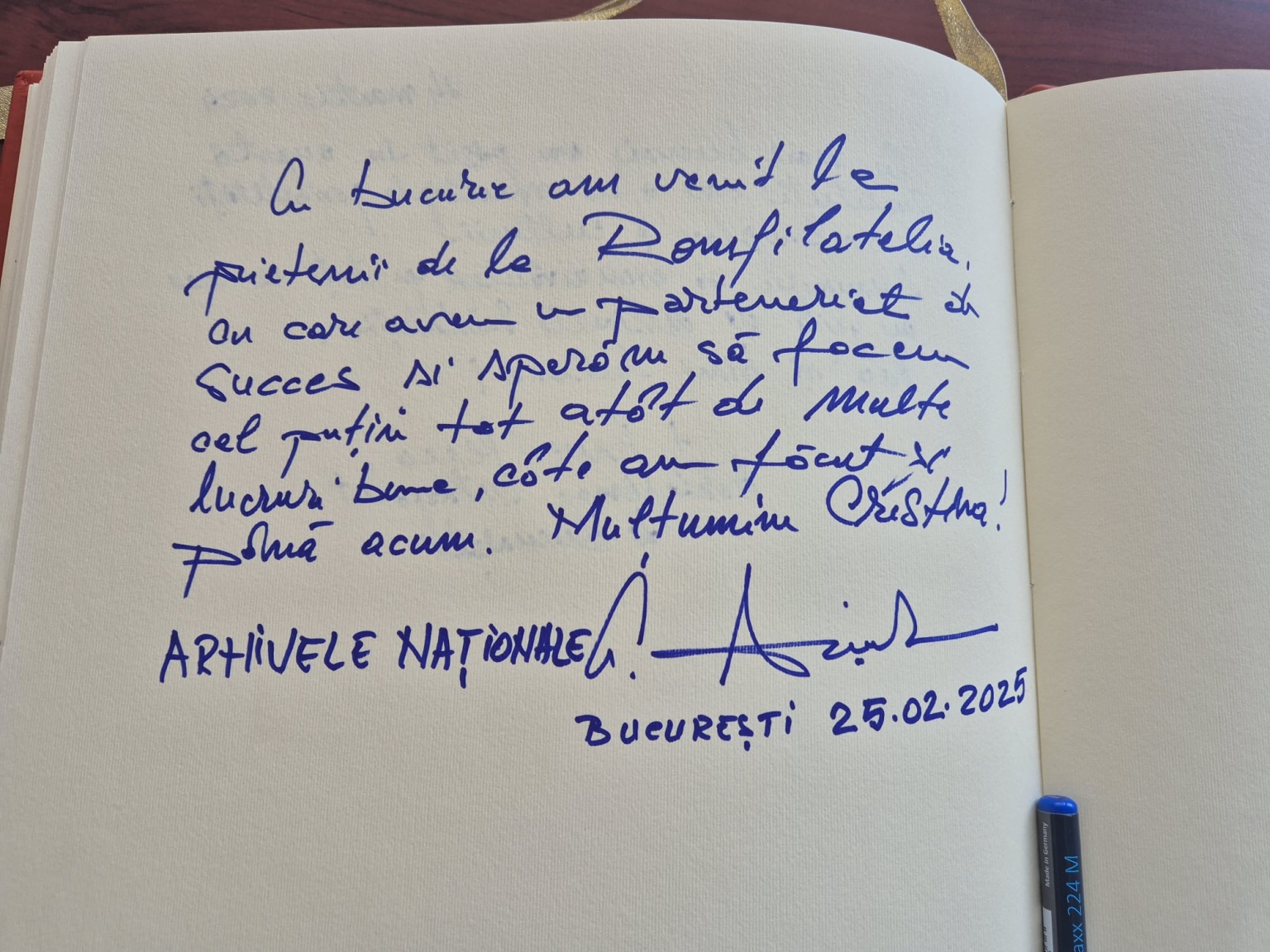 Domnul director Dr. Cristian Anița a apreciat timbrele românești, experiența și implicarea Romfilatelia în proiectele dedicate valorilor istorice și culturale naționale și a avut amabilitatea de a adăuga câteva cuvinte în cartea de onoare a societăţii:
