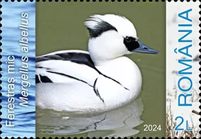 Ferestrașul mic (Mergellus albellus), ilustrat pe timbrul cu valoarea nominală de 2 Lei, este o specie de păsări acvatice înrudite cu rațele, gâștele și lebedele.