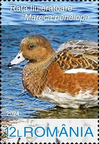 Rața fluierătoare (Mareca penelope), ilustrată pe timbrul cu valoarea nominală de 12 Lei, este o specie care cuibărește în Europa de Nord și Asia și migrează pentru iernare pe distanțe foarte mari. Specia poate apărea în România în timpul migrației, atât toamna, cât și primăvara.