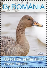 Gâsca de semănătură (Anser fabalis), reprezentată pe timbrul cu valoarea nominală de 13 Lei, este o specie cu o distribuție largă în Eurasia, reproducându-se în nordul Europei, precum și în Siberia. În România este o specie rară.