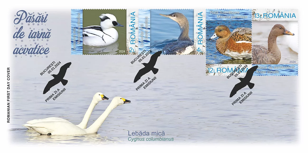 Romfilatelia pune la dispoziția colecționarilor și a publicului larg, o nouă emisiune cu tematica Faună, sub titlul generic „Păsări de iarnă acvatice”, compusă din patru timbre, un plic „prima zi” și o mapă filatelică cu produs special în tiraj limitat. Emisiunea va fi introdusă în circulație vineri, 5 ianuarie 2024.