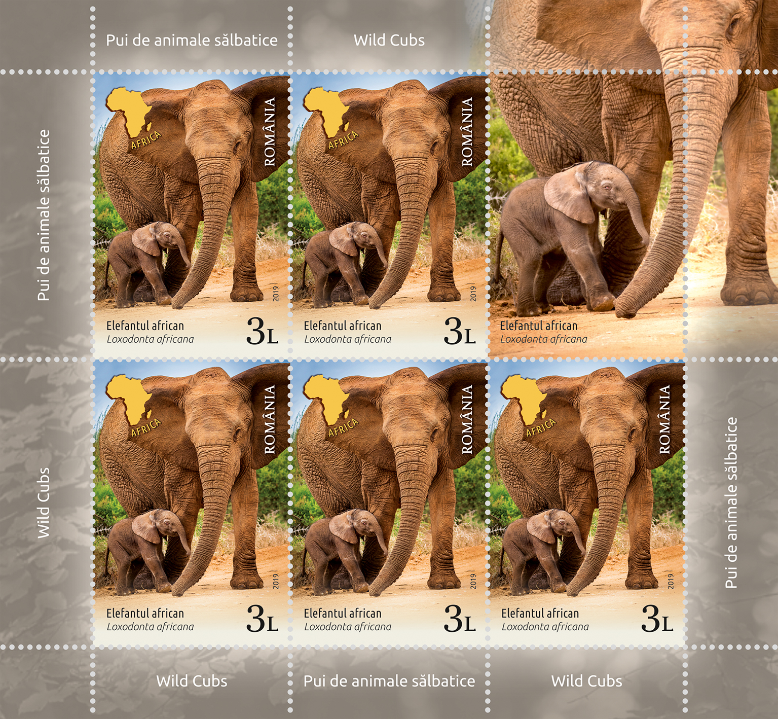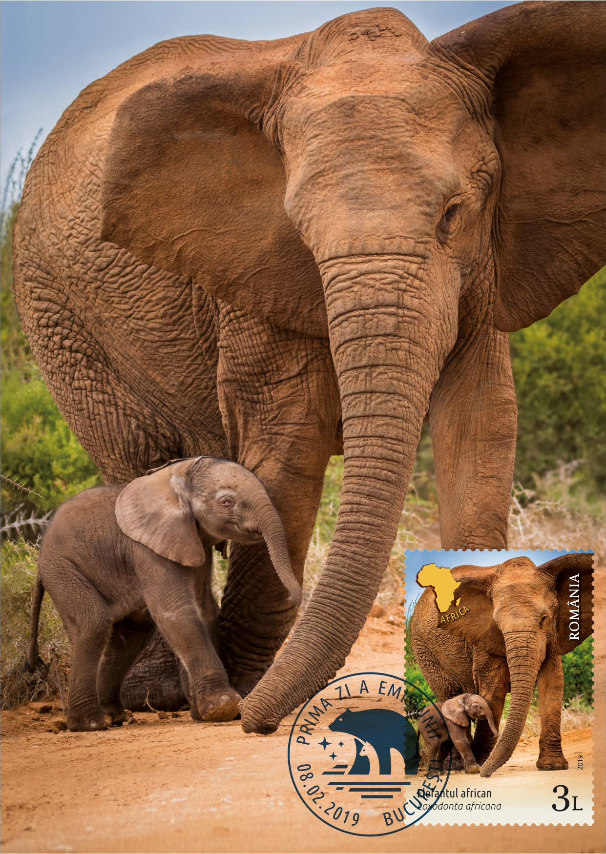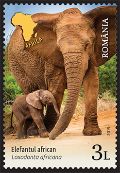 Pe primul timbru, cu valorea nominală de 3 Lei, este ilustrat puiul de elefant african (Loxodonta africana), alături de mama lui.