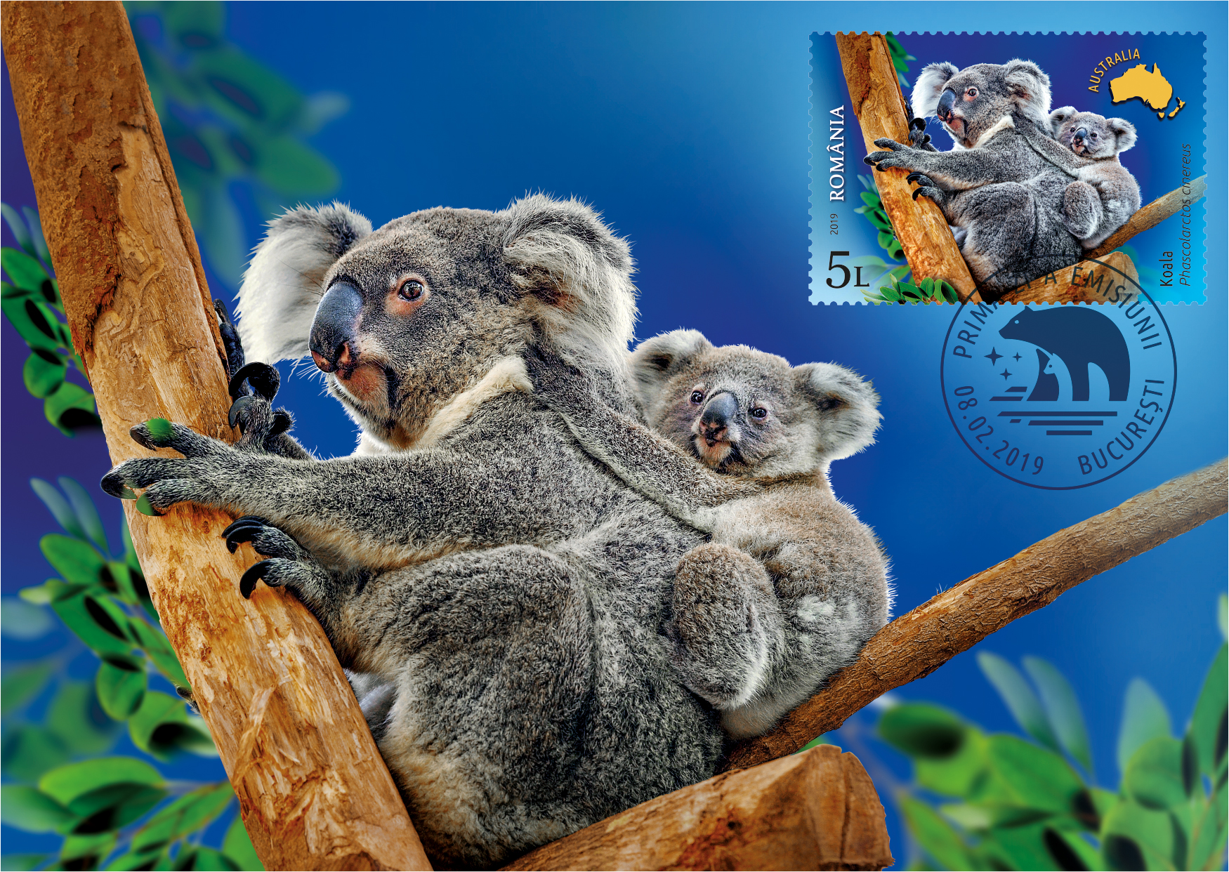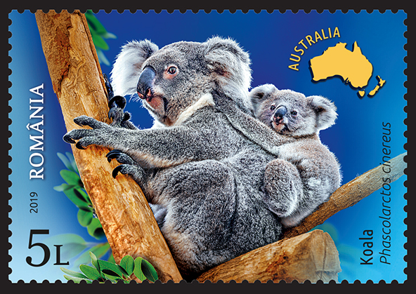 Pe al doilea timbru cu valoarea nominală de 5 Lei este ilustrat puiul de koala (Phascolarctos cinereus), purtat în spate de mama sa, în timpul cățărării unui copac de eucalipt.