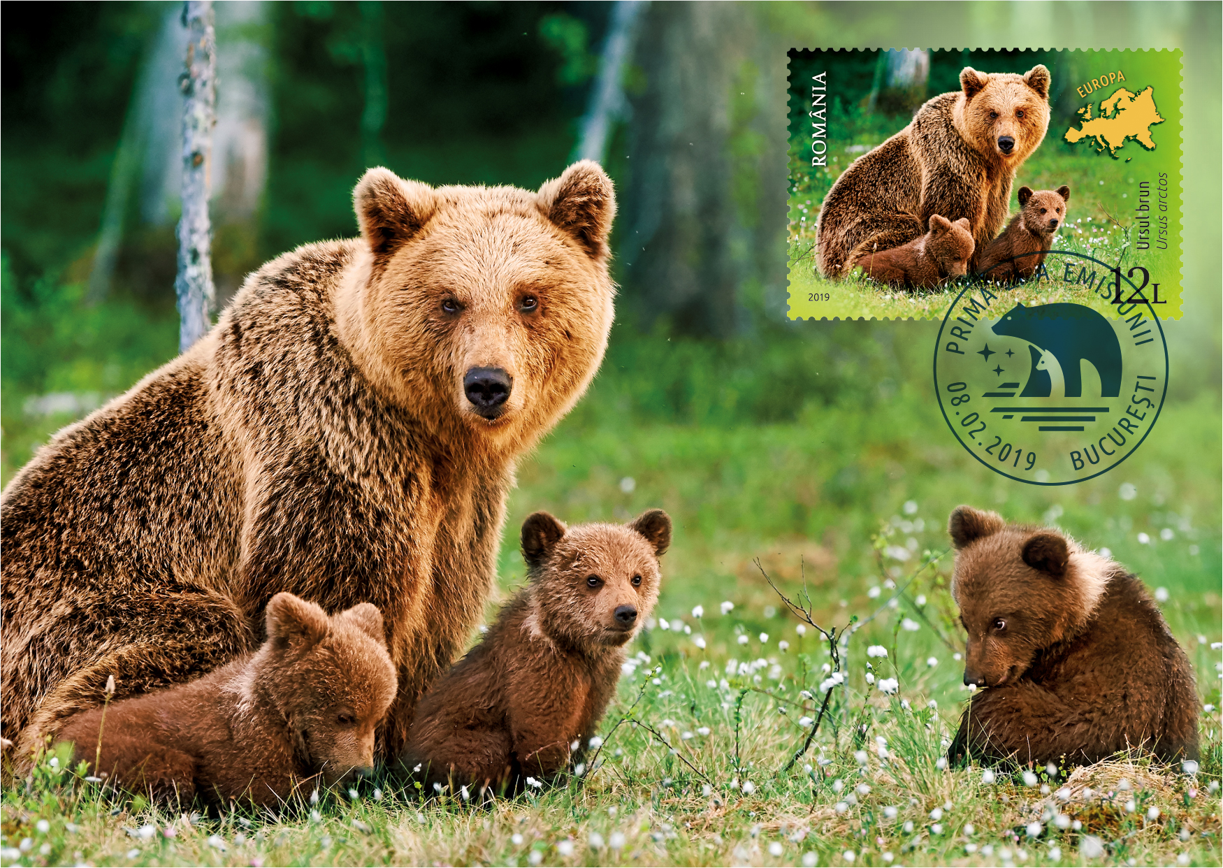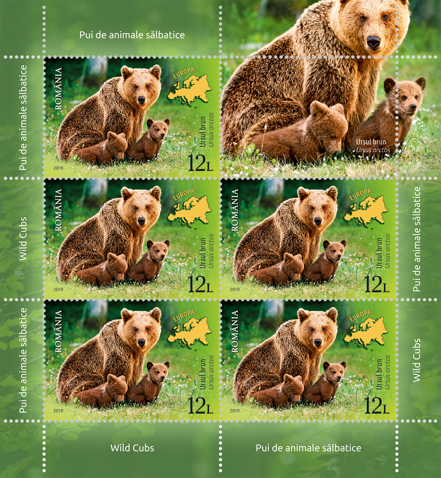 Pe al patrulea timbru, cu valoarea de 12 Lei, sunt ilustrați doi pui de urs brun (Ursus arctos), alături de mama lor.