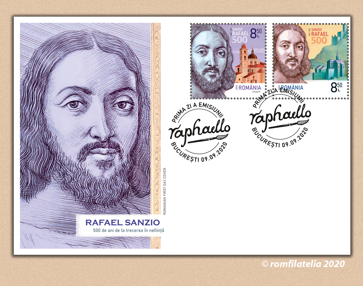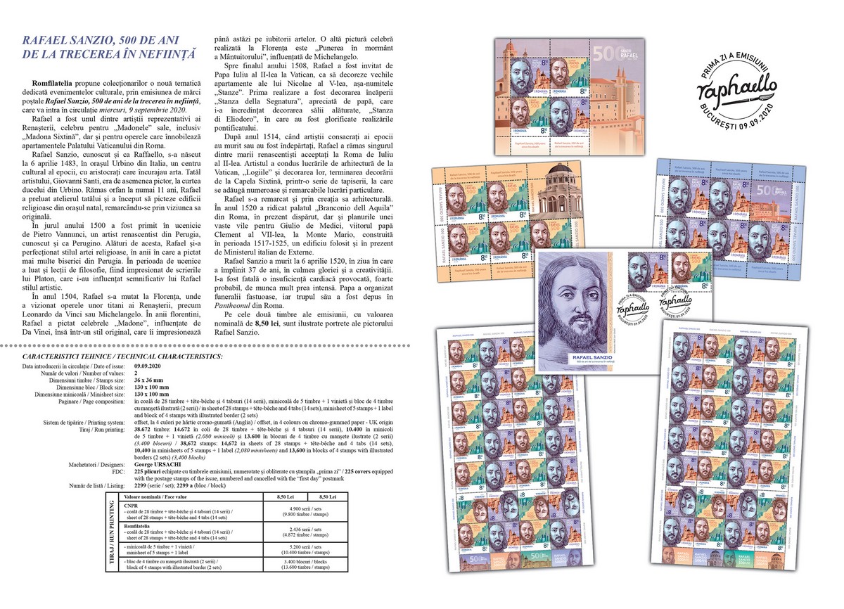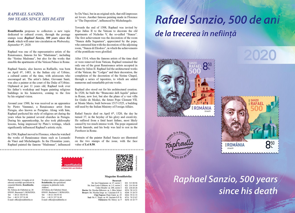 Emisiunea de mărci poștale „Rafael Sanzio, 500 de ani de la trecerea în neființă” va fi disponibilă începând de miercuri, 9 septembrie 2020, în magazinele Romfilatelia din București, Bacău, Brașov, Cluj-Napoca, Iași, Timișoara, precum și în magazinul nostru online: https://romfilatelia.ro/store/. Aceasta este completată de plicul „prima zi”, coala de 28 timbre + tęte-bęche și 4 tabsuri (14 serii), minicoala de 5 timbre + 1 vinietă și bloc de 4 timbre cu manșetă ilustrată (2 serii).