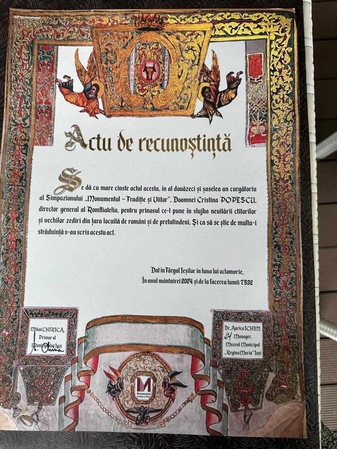 Edilul Iașului, Mihai Chirica a conferit Romfilatelia Diploma “Actu de recunoștință” pentru contribuția la promovarea valorilor culturale și istorice ieșene.