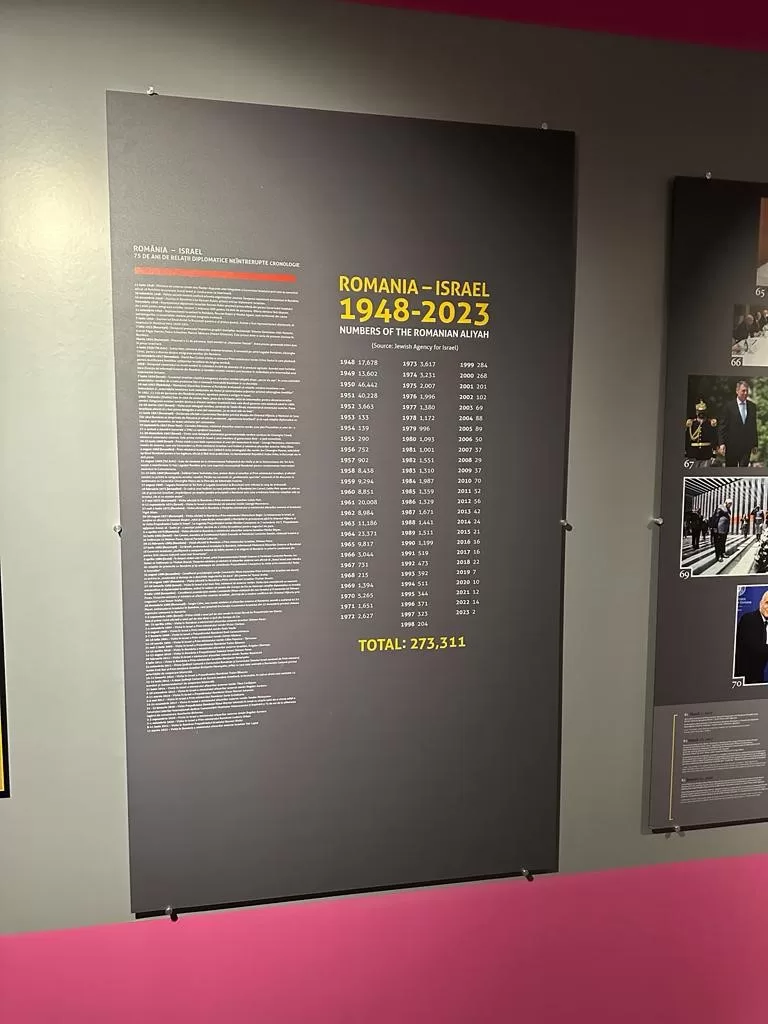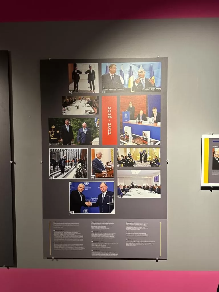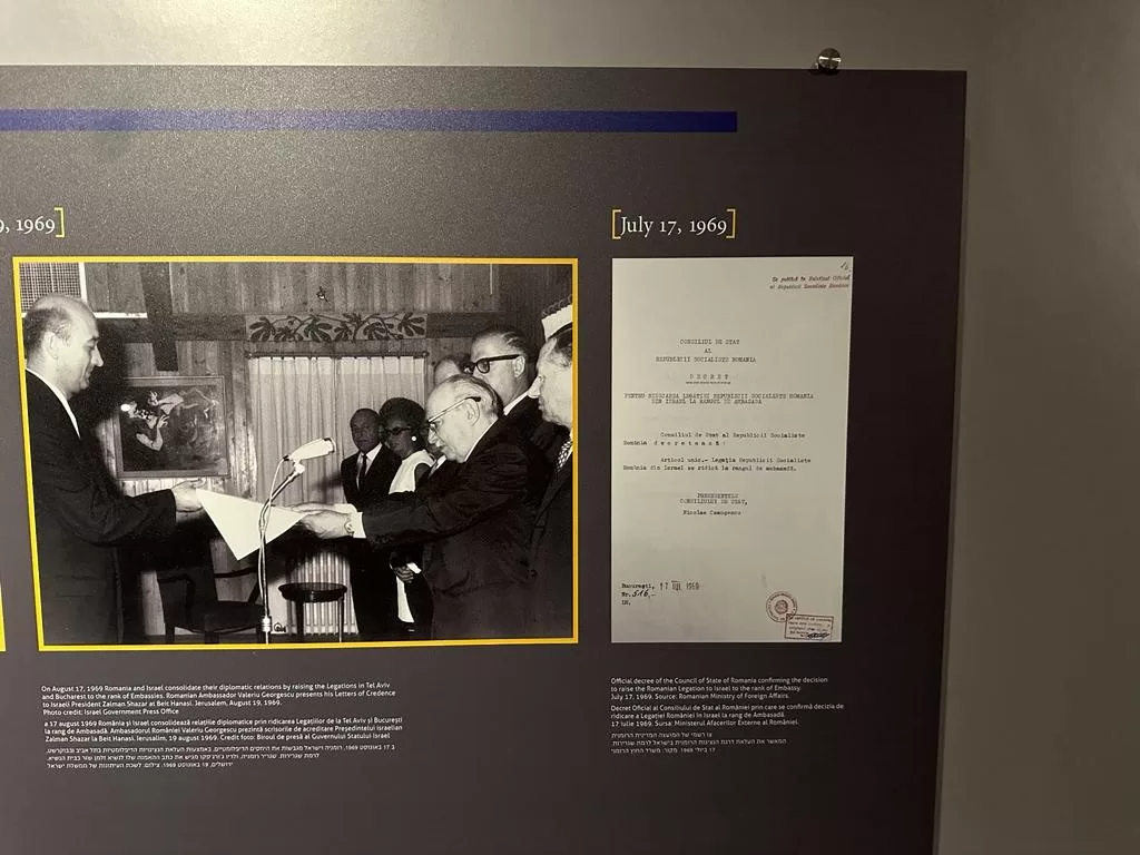 Expoziţia documentară de fotografii şi documente de arhivă reflectă cele mai importante momente ale relaţilor bilaterale existente între România și Statul Israel.