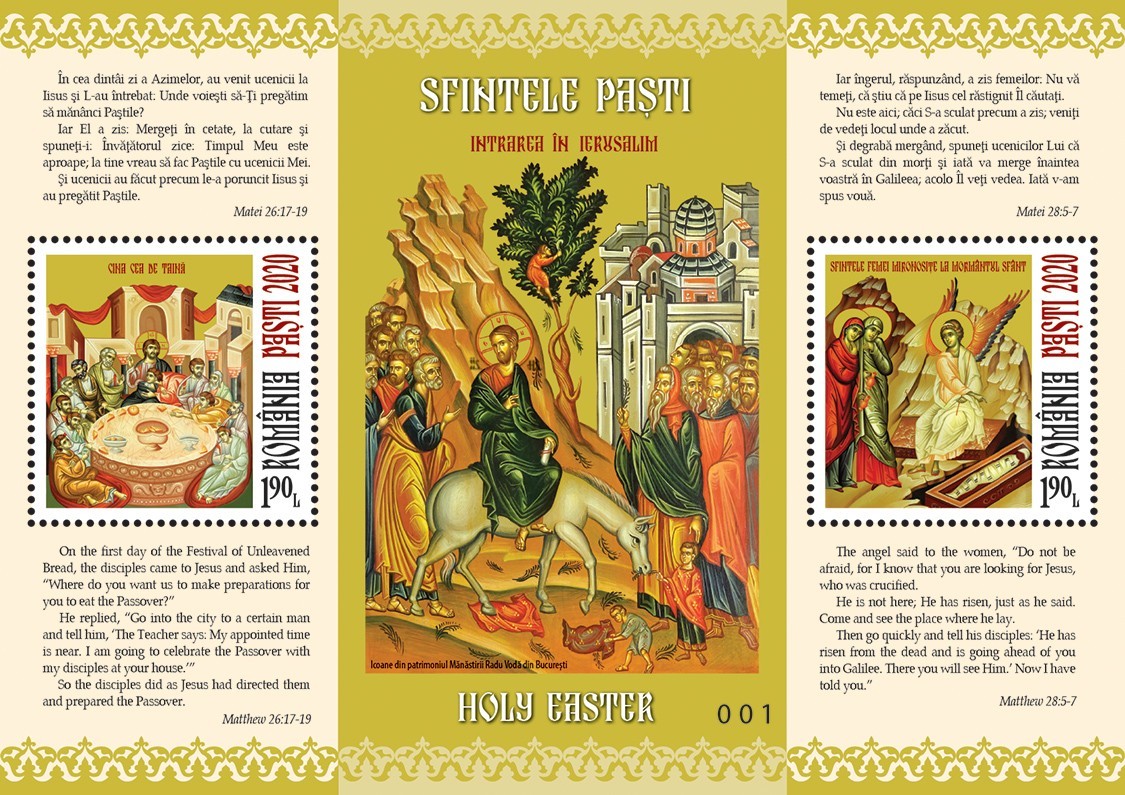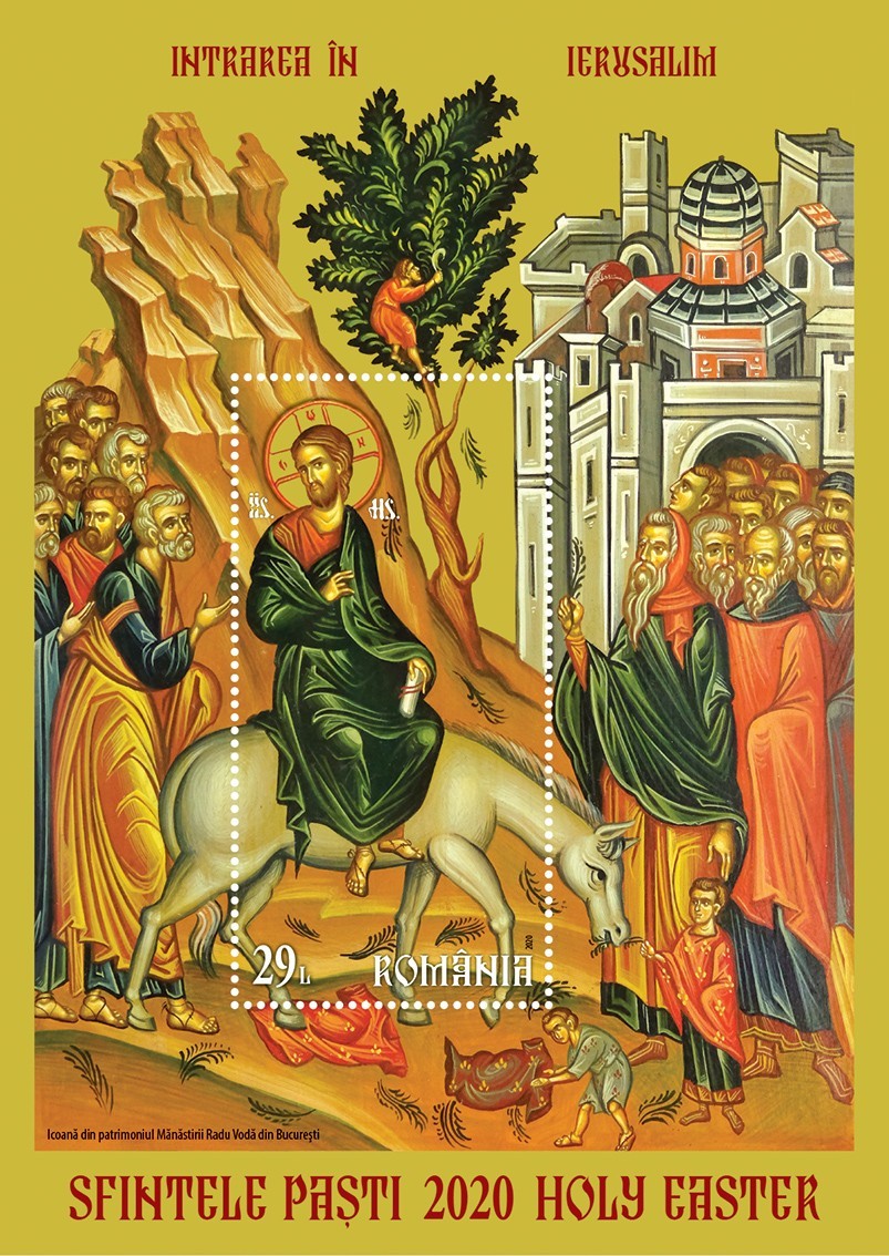 Sărbătoarea Paștilor începe, conform ritualului creștin, cu o frumoasă zi de Duminică, înscrisă în calendarul ortodox drept Duminica Floriilor. Este ziua în care Iisus Hristos, însoțit de o mulțime mare de oameni a intrat în Ierusalim. Așternându-și hainele în calea Lui, copiii, tinerii și bătrânii care auziseră de minunile Sale L-au întâmpinat cu ramuri de finic în mâini, ca pe Împăratul împăraților, ca pe un împărat biruitor asupra împărăției răului. ,,Osana Fiul lui David binecuvântat este Cel ce vine întru numele Domnului! Osana întru Cel de sus!’’, strigau ei. Colița emisiunii cu valoarea nominală de 29 lei ilustrează sugestiv această scenă.