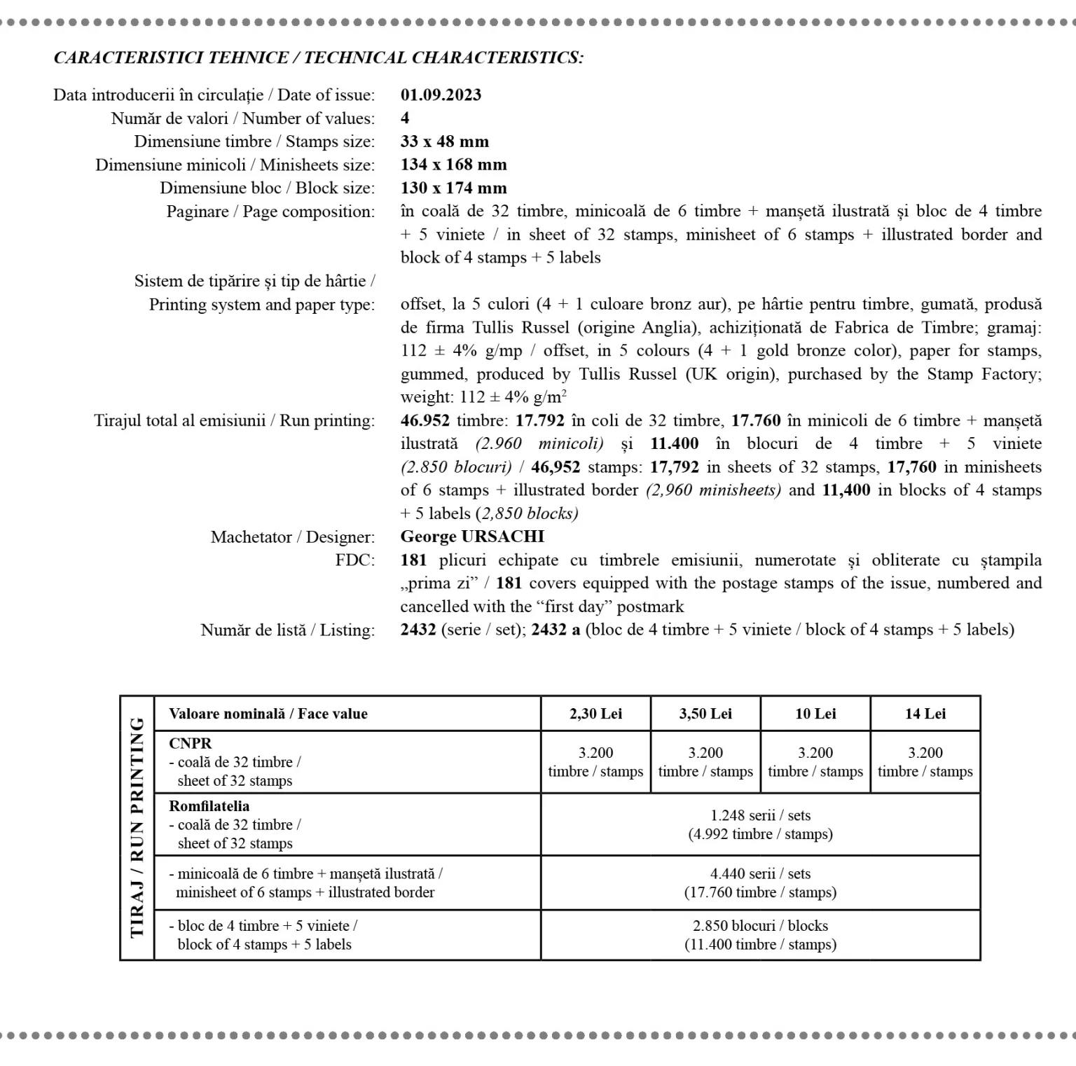 Emisiunea va fi disponibilă de Vineri, 1 septembrie a.c., în rețeaua magazinelor Romfilatelia din București, Bacău, Brașov, Cluj-Napoca, Iași, Timișoara, precum și în magazinul nostru online: https://romfilatelia.ro/store/.