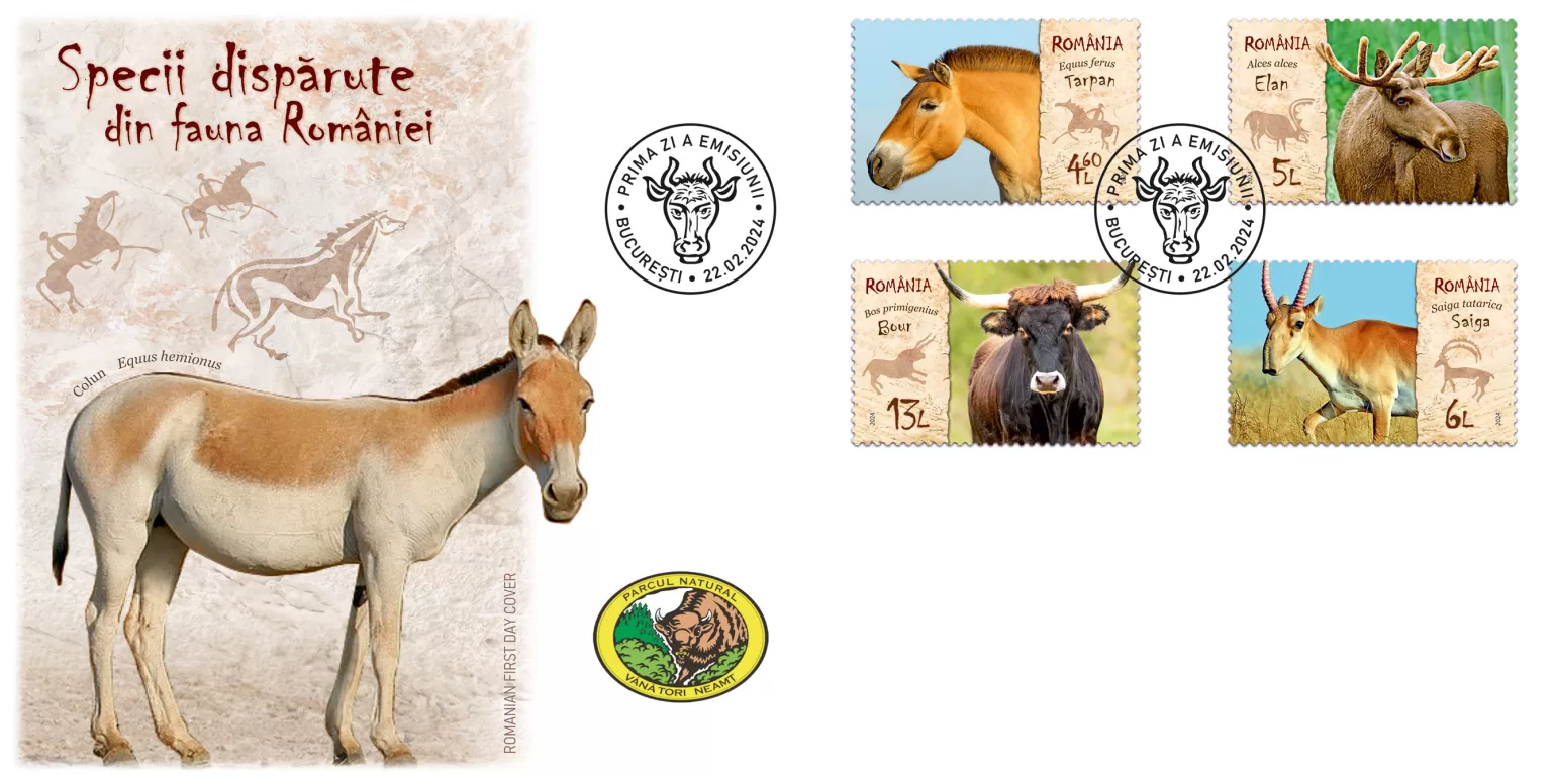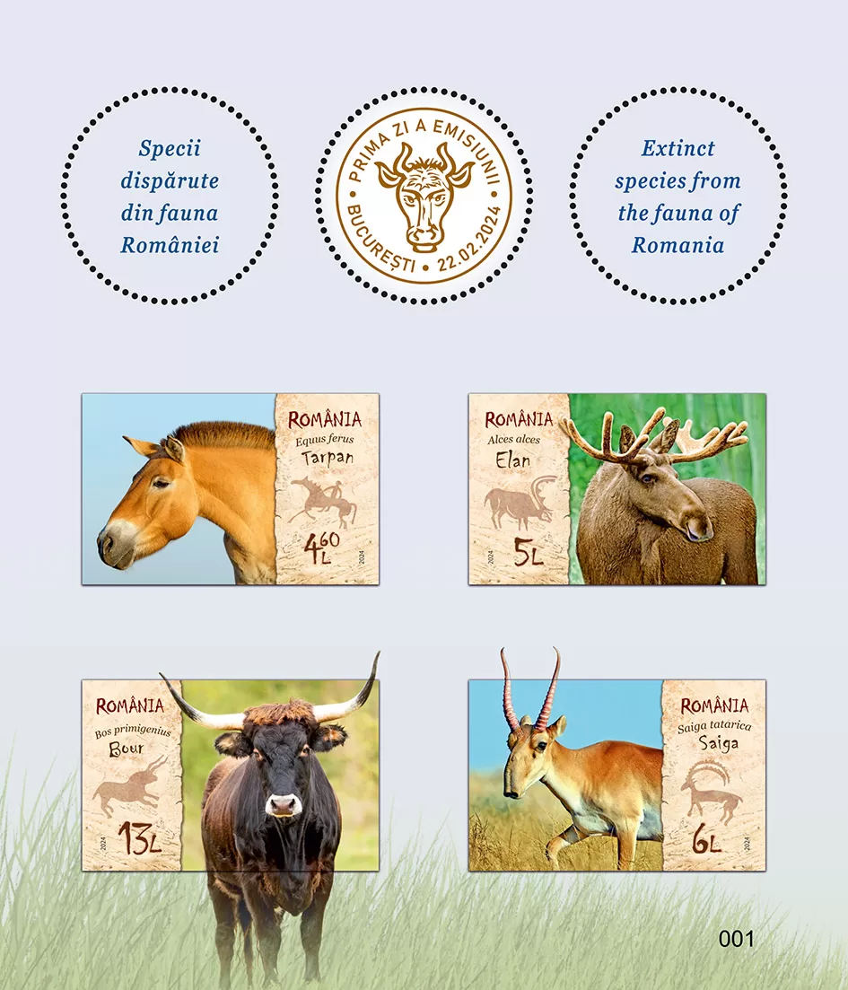 Romfilatelia pune la dispoziția colecționarilor și a publicului larg, o nouă emisiune cu tematica Faună, sub titlul generic „Specii dispărute din fauna României”, compusă din patru timbre, un plic „prima zi” și un produs special în tiraj limitat. Emisiunea va fi introdusă în circulație joi, 22 februarie 2024.