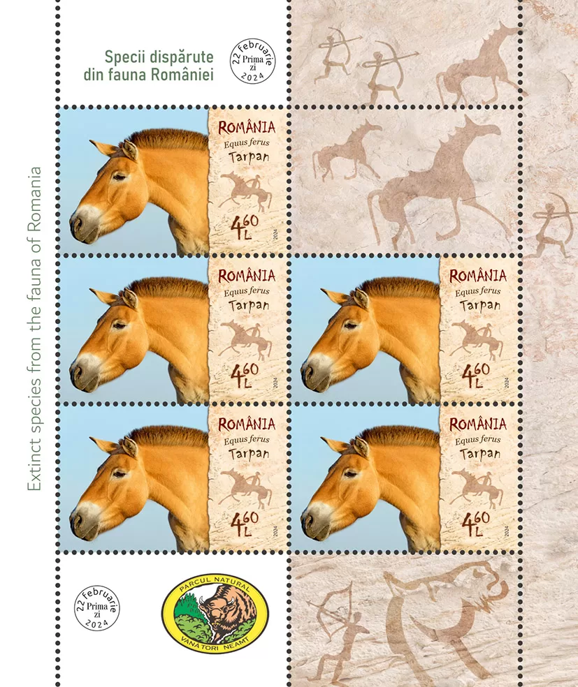 Pe timbrul cu valoarea nominală de 4,60 lei este ilustrat Tarpanul – calul sălbatic (Equus ferus). Caii sălbatici au fost prezenți în stepele înghețate ce se întindeau din Câmpia de Nord Europeană și Siberia. Aceștia au existat și pe teritoriul actualei Românii, dovezile arheologice acoperind aproape întreaga țară.