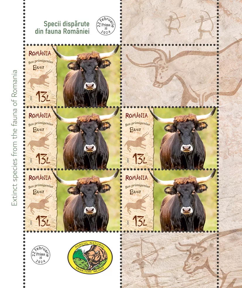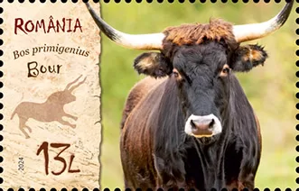 Bourul (Bos primigenius) este redat pe timbrul cu valoarea nominală de 13 lei.