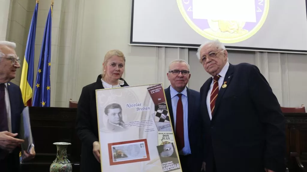 Romfilatelia, invitată la evenimentul găzduit de Aula Academiei Române, i-a oferit domnului Breban, renumit și distins om de cultură și membru al Academiei Române, un produs filatelic special, având ca piesă centrală întregul poștal aniversar.