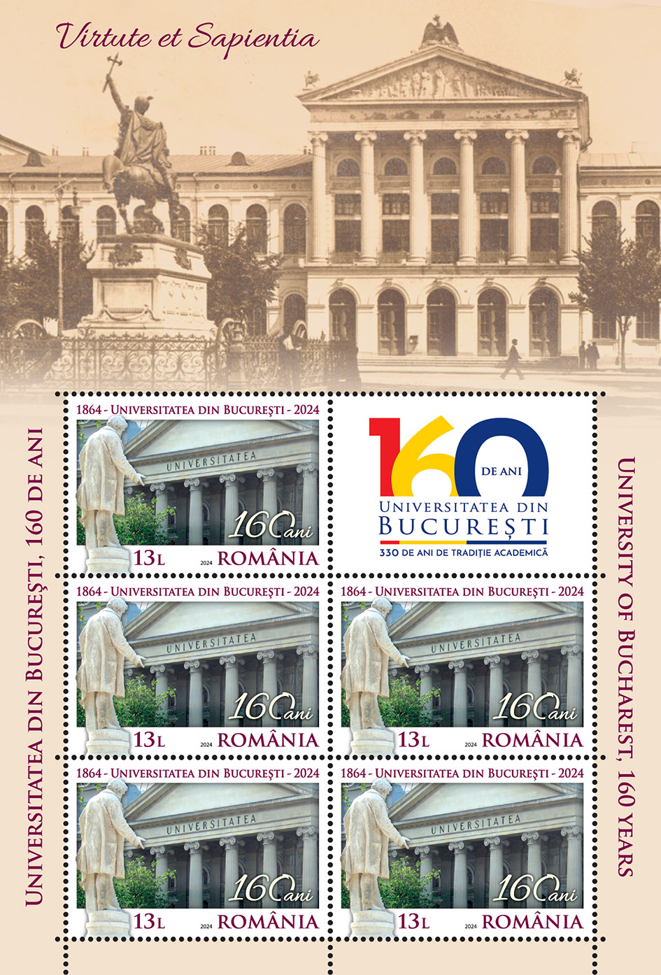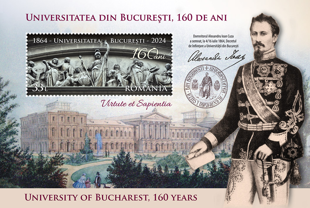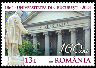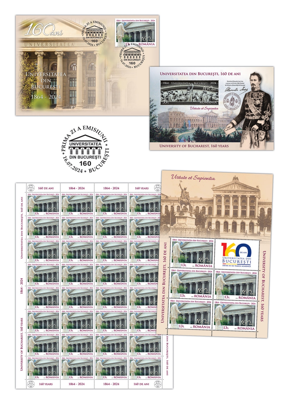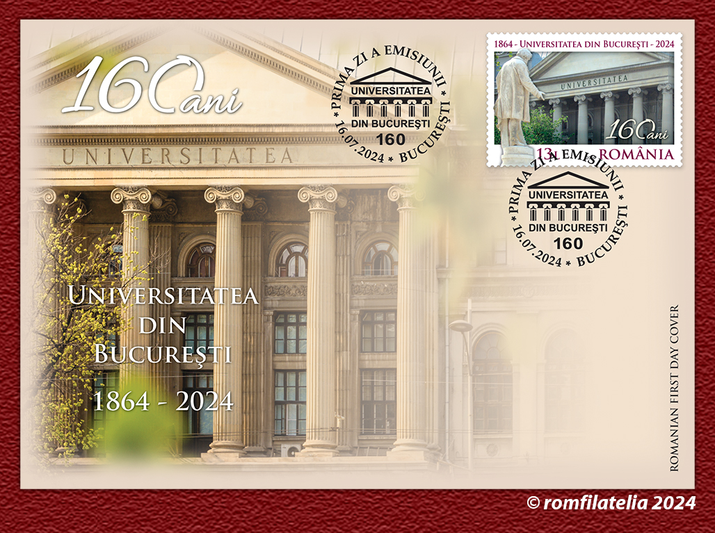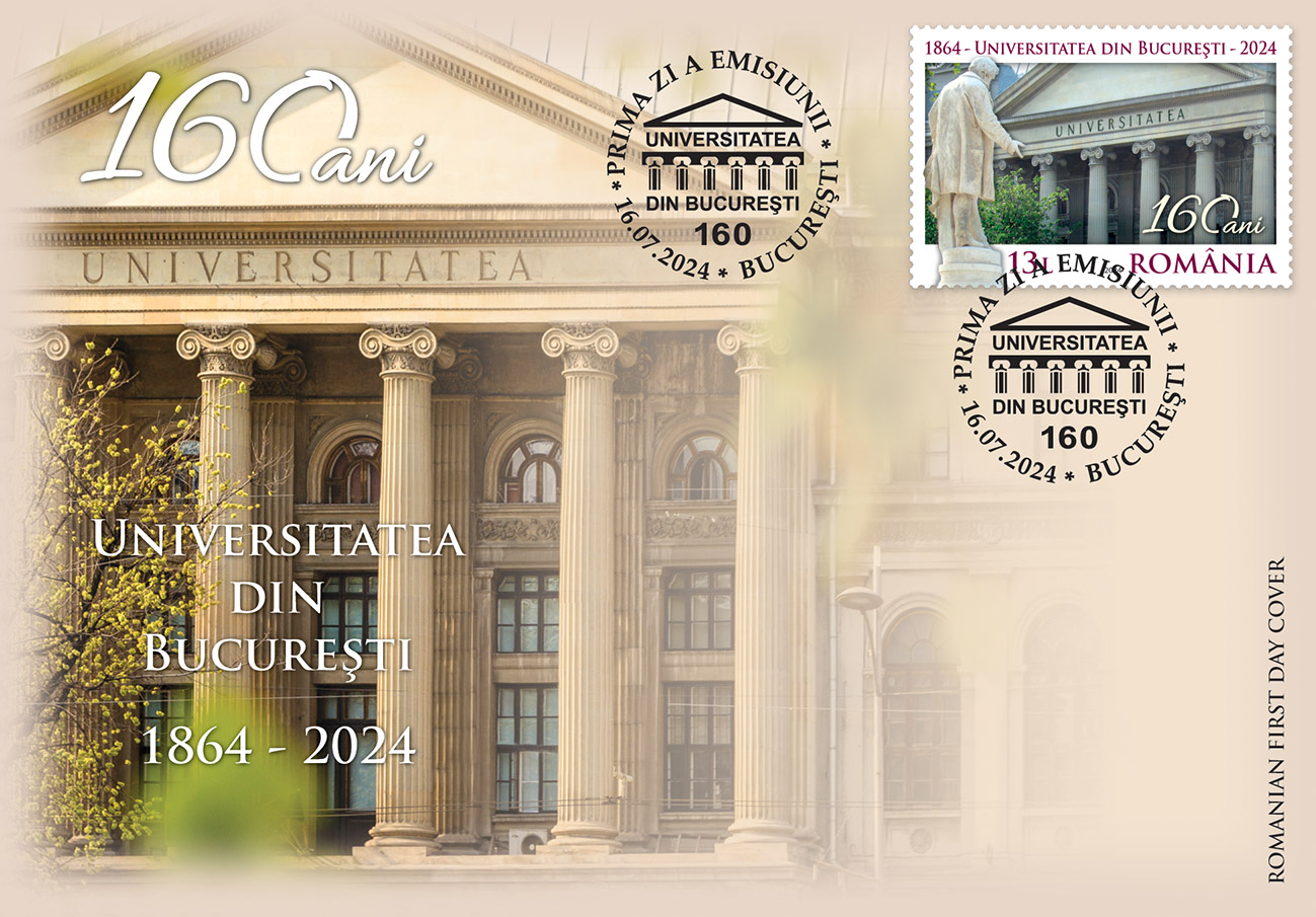 Romfilatelia introduce în circulație marți, 16 iulie a.c. emisiunea filatelică Universitatea din București, 160 de ani formată din o marcă poștală, o coliță filatelică și un plic „prima zi”. Emisiunea aniversară se dorește a fi un mod de cinstire a unei instituții de prim rang în ierarhia structurii învățământului superior din România.