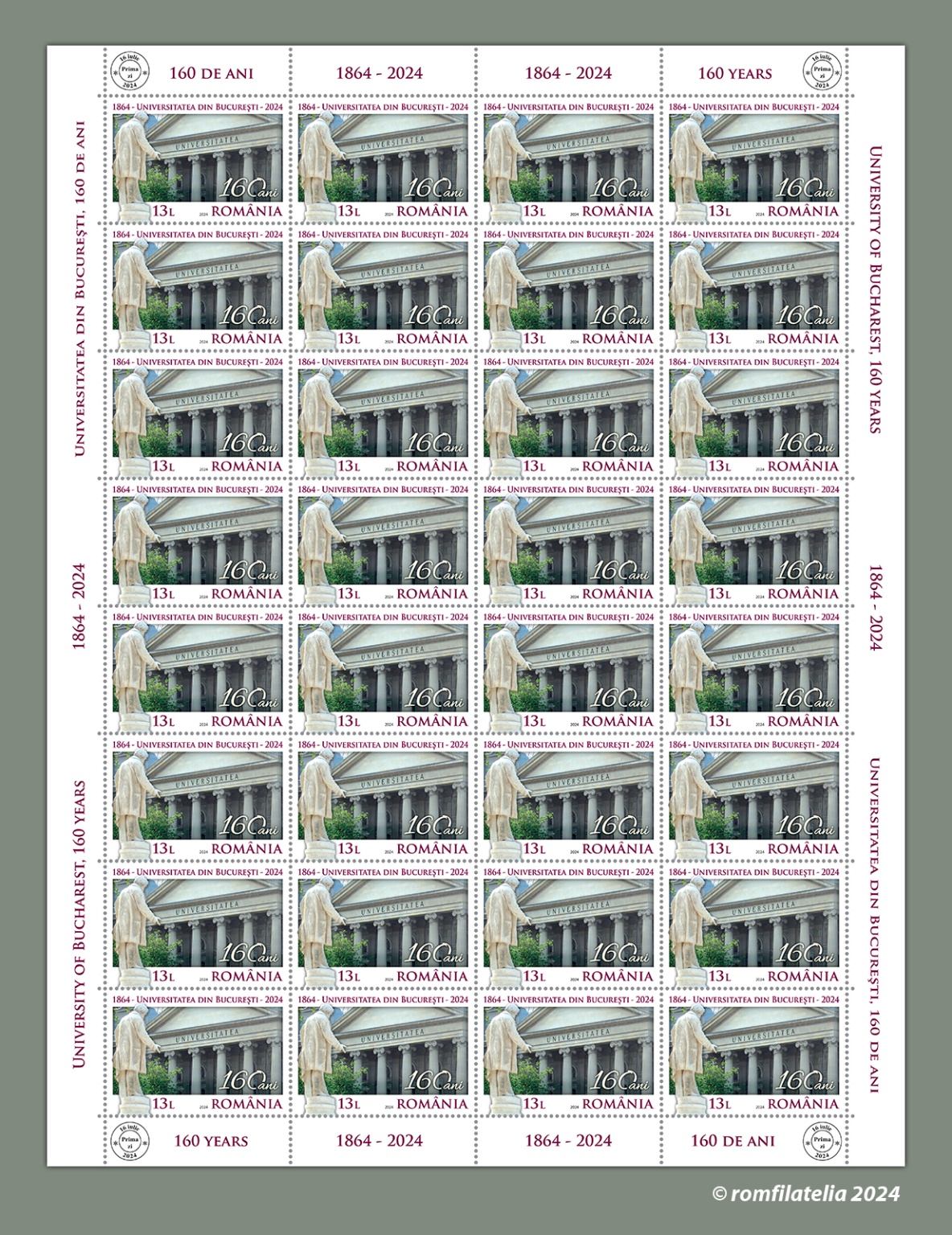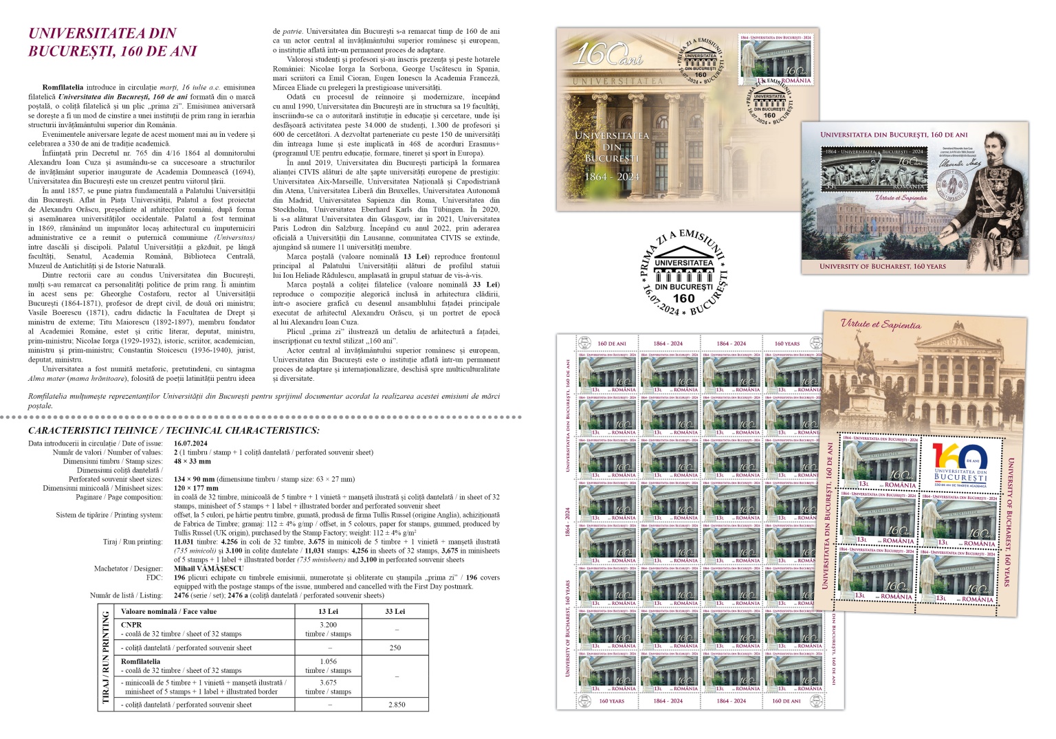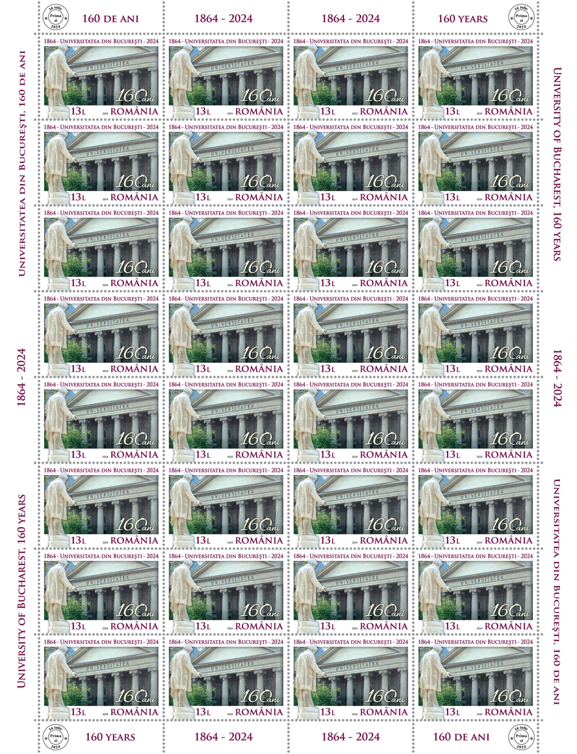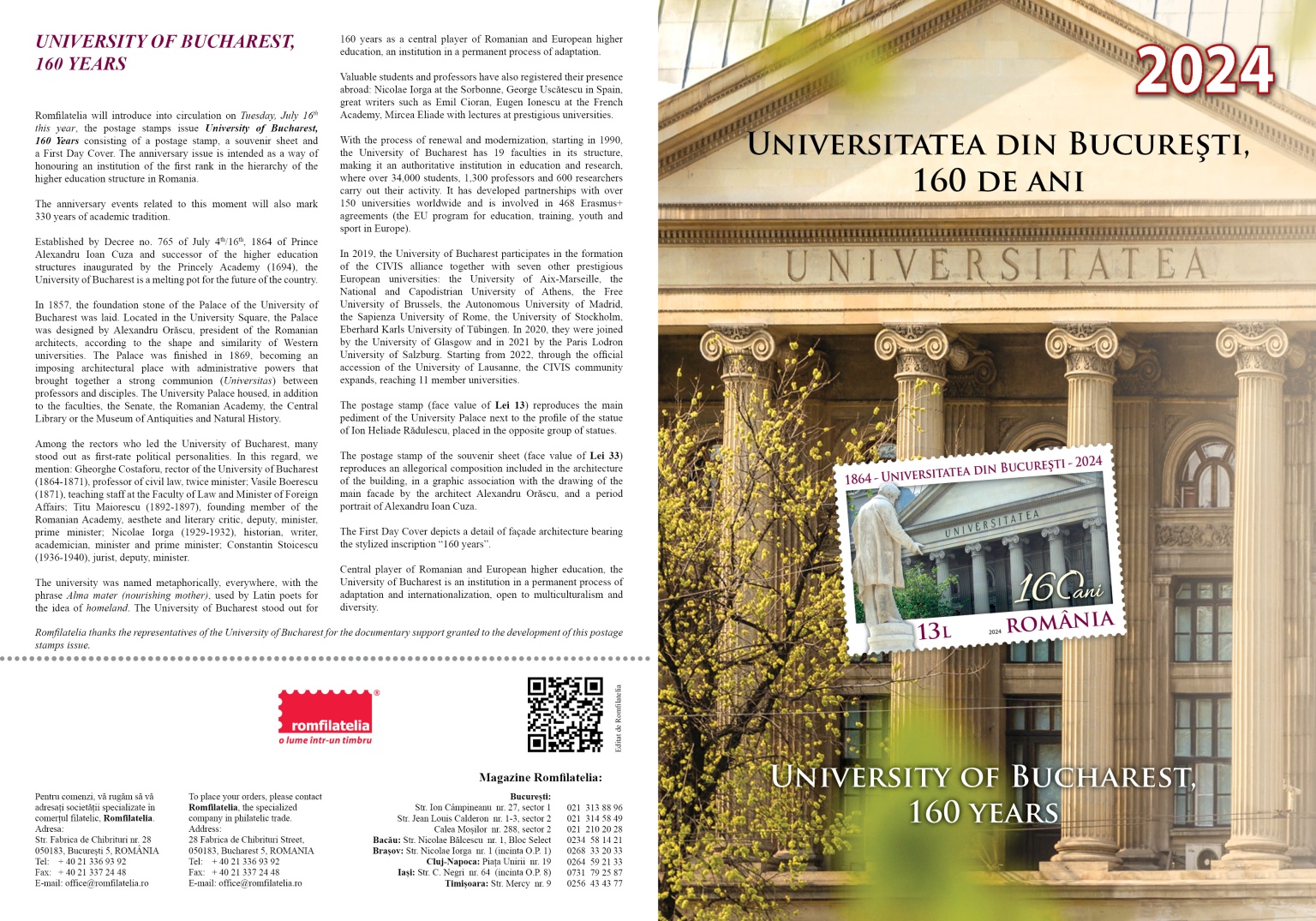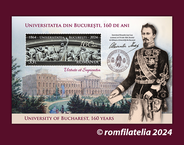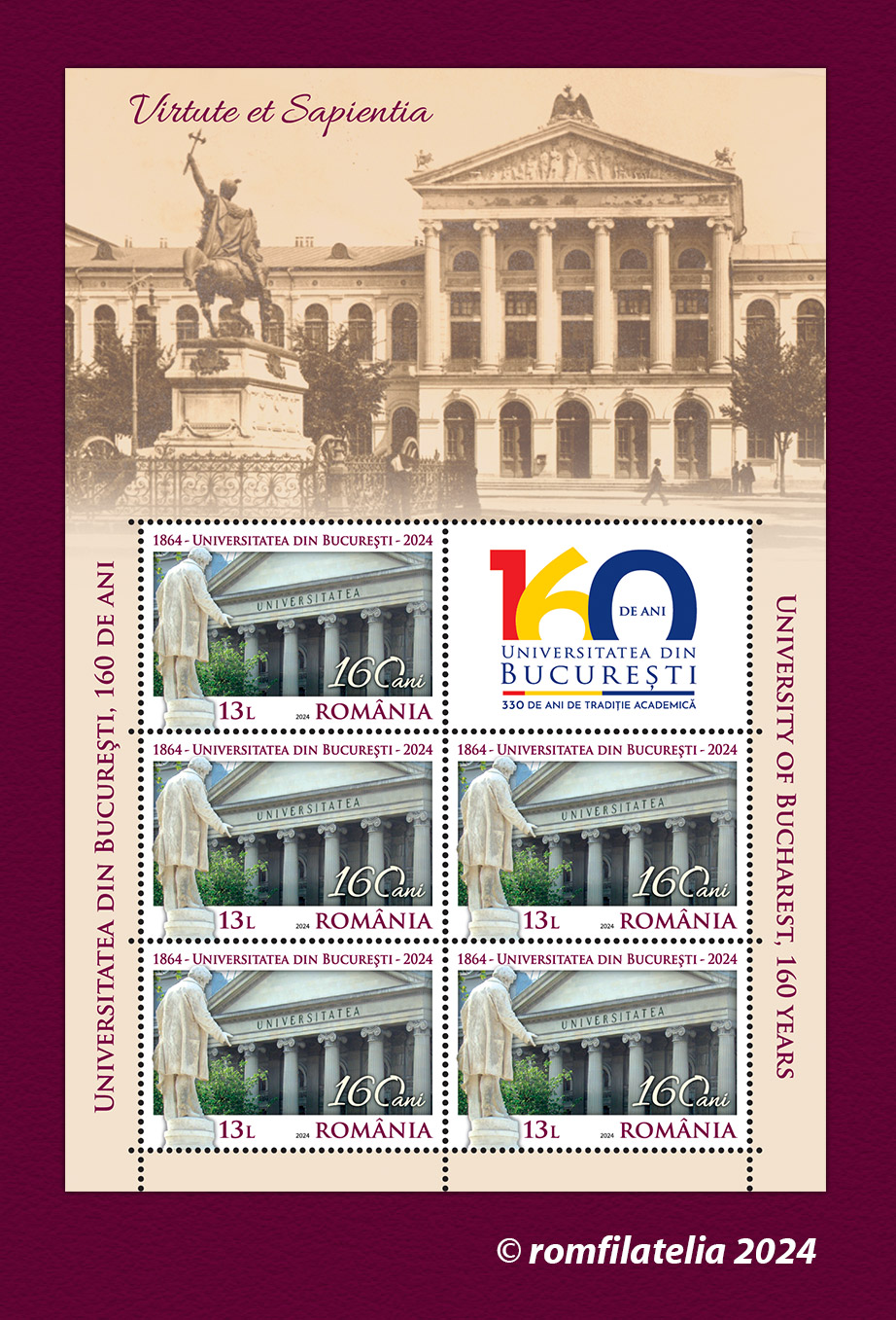 Romfilatelia introduce în circulație marți, 16 iulie a.c. emisiunea filatelică Universitatea din București, 160 de ani formată din o marcă poștală, o coliță filatelică și un plic „prima zi”. Emisiunea aniversară se dorește a fi un mod de cinstire a unei instituții de prim rang în ierarhia structurii învățământului superior din România.