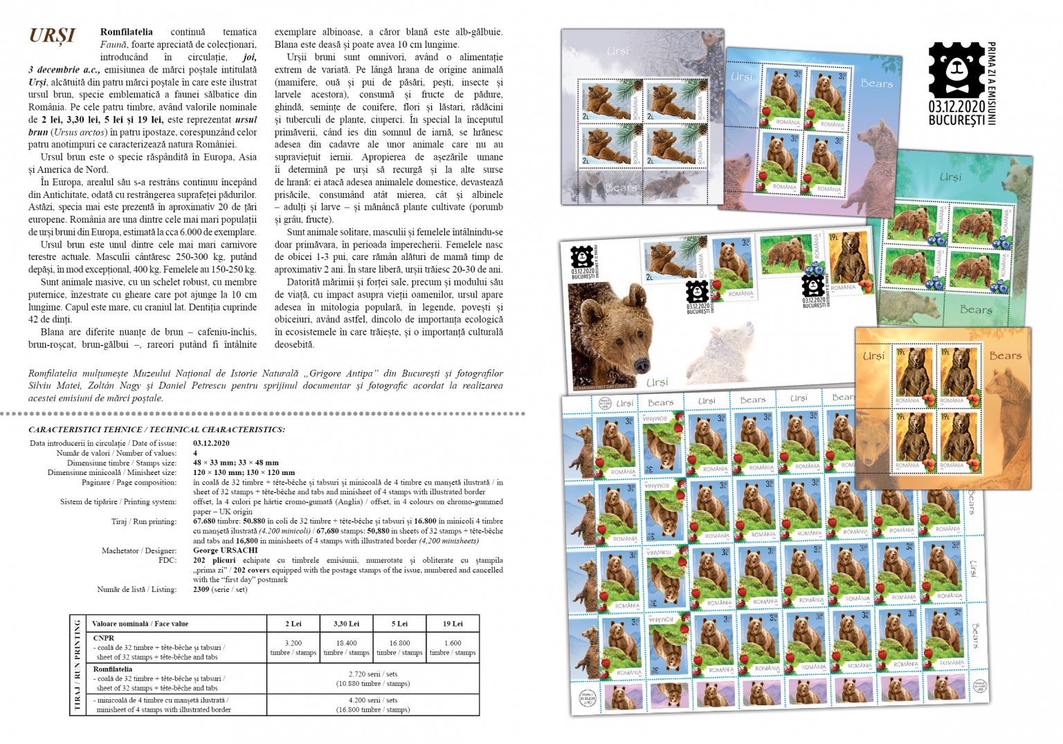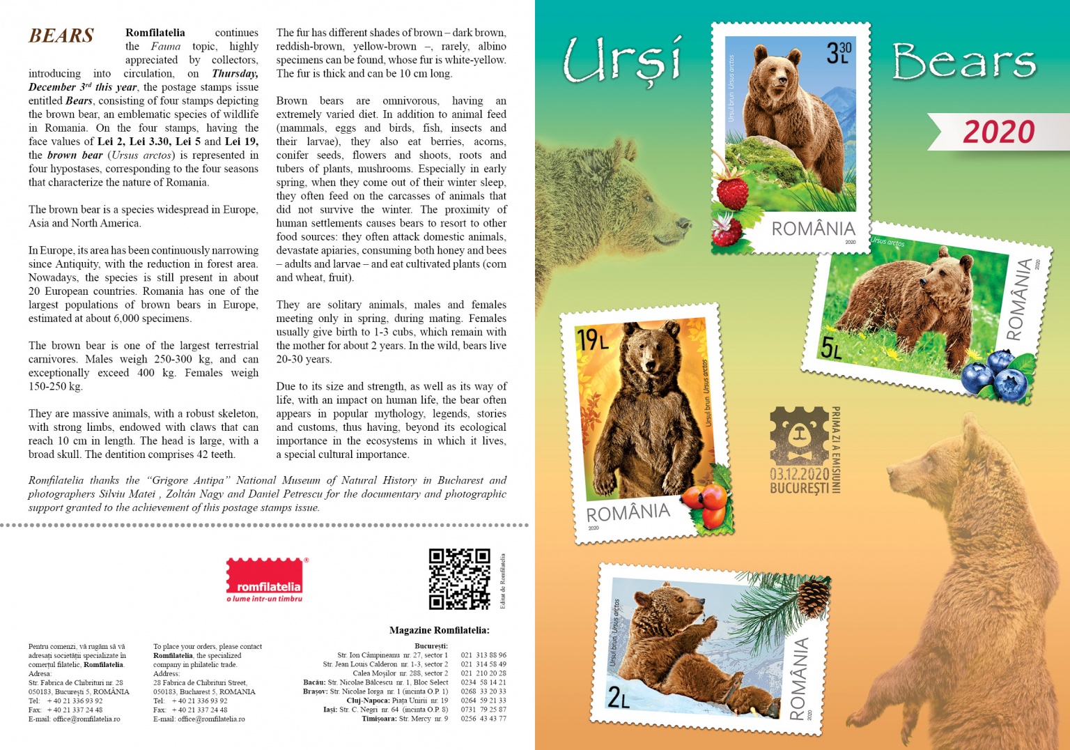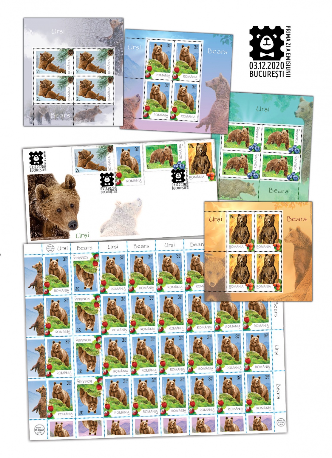 Emisiunea de mărci poștale „Urși” va fi disponibilă începând de joi, 3 decembrie 2020, în magazinele Romfilatelia din București, Bacău, Brașov, Cluj-Napoca, Iași, Timișoara, precum și în magazinul nostru online: https://romfilatelia.ro/store/. Aceasta este completată de plicul „prima zi”, coală de 32 timbre + tęte-bęche și tabsuri și minicoală de 4 timbre cu manșetă ilustrată.