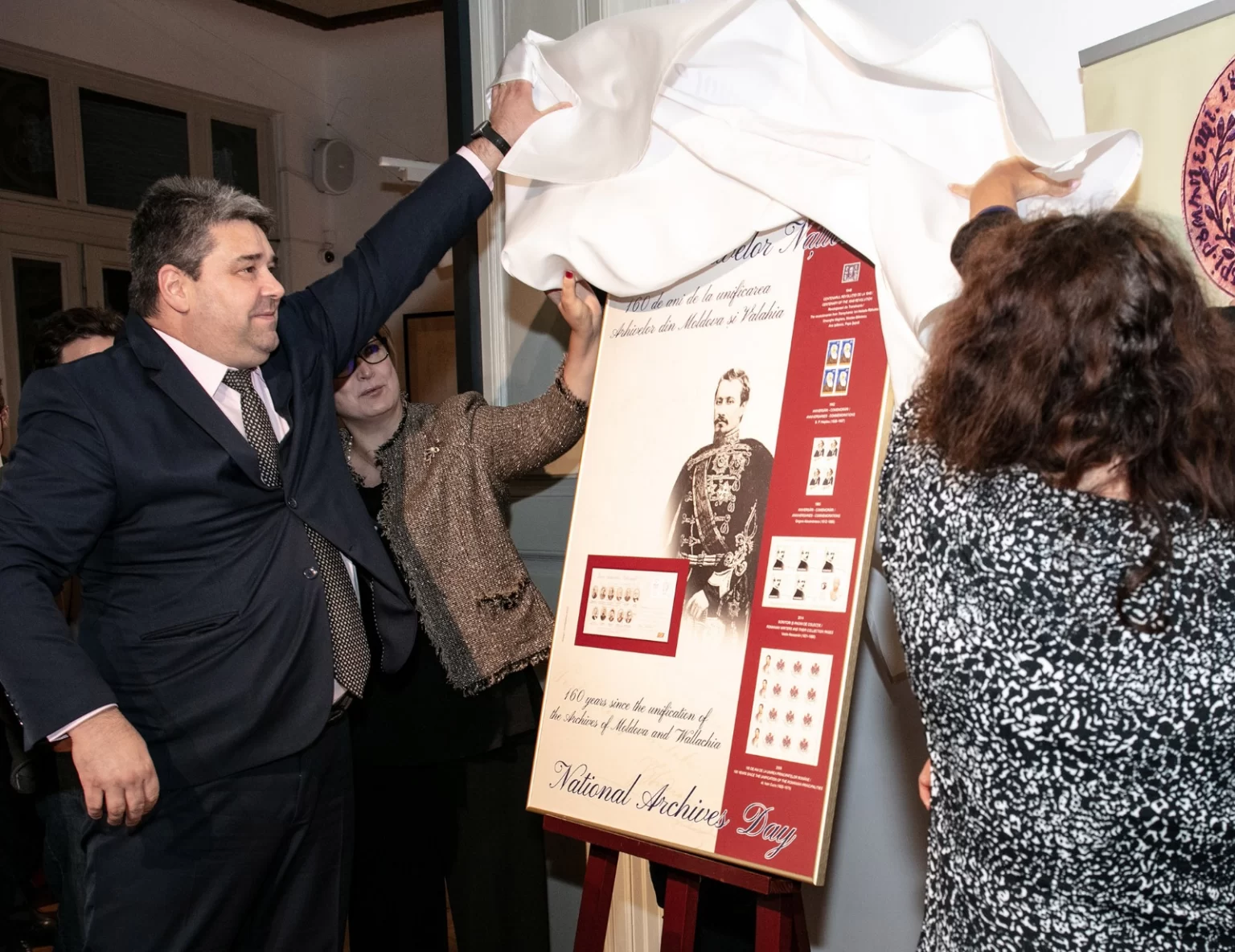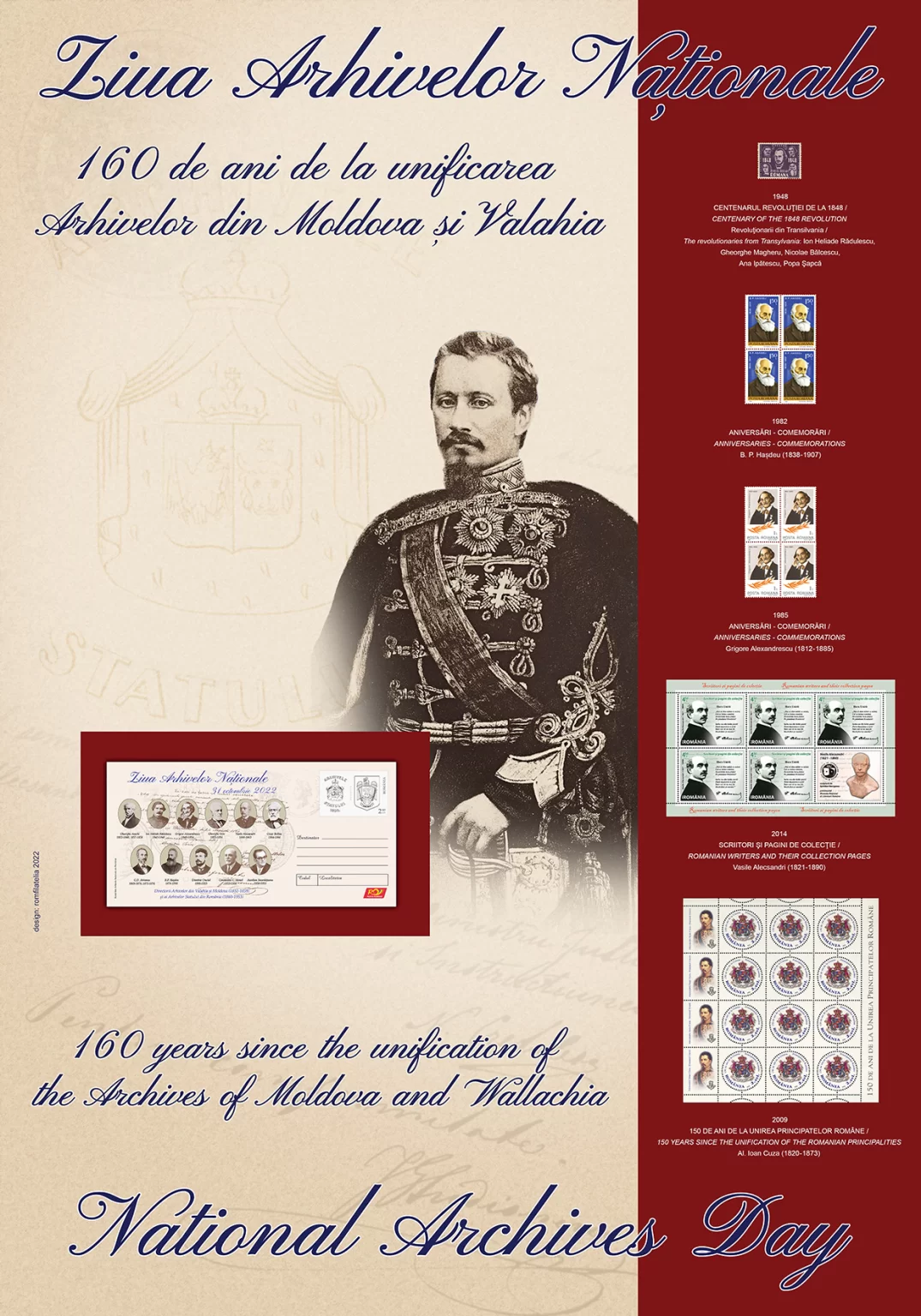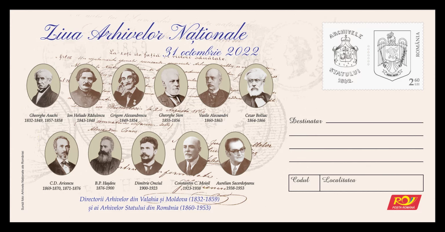 Prezentă, ca de obicei la evenimentele aniversare ale principalelor Instituții ale Statului, Romfilatelia a introdus în circulație un produs special filatelic care să marcheze Ziua Arhivelor Naționale la 160 de ani de la punerea bazelor instituției în primul an când Principatele Unite se prezentau lumii cu Numele de România – anul 1862.