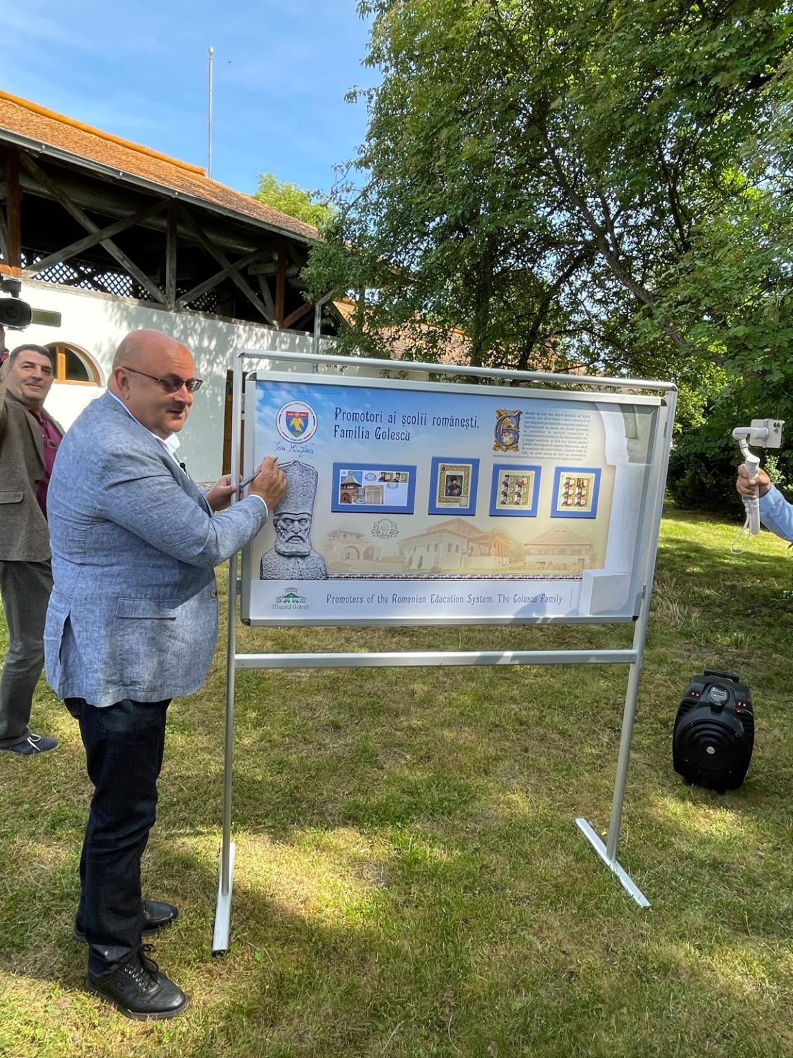 Într-un loc marcat de istorie și intr un moment sărbătoresc motivat de împlinirea a 85 de ani de existență a unui muzeu care a purtat, de la înființarea lui de către Carol al II-lea (7 iunie 1939), numele cărturarului Dinicu Golescu, a avut loc prezentarea emisiunii de mărci poștale și lansarea albumului filatelic „Promotori ai școlii românești. Familia Golescu”. Amintiri despre filatelie, pasiunea de a colecționa timbre, au fost împărtășite de Președintele Consiliului Județean Argeș, Ion Mînzînă, Prof. univ. dr. Ioan Opriș, Directorul Muzeului, Narcis Iustin Dejanu, învitați, membri ai Inspectoratului școlar, ai administrației locale, reprezentanți ai domeniului cultural, prieteni. Prezenți la evenimentele istorice ale țării și în tezaurul culturii românești, cărturarii Goleștilor se regăsesc de acum în cea mai cunoscută și mirifică „lume a timbrelor”. Colița filatelică reproduce portretul marelui ban Radu Golescu, nedespărțit de pana și hârtia pentru scris, alături de un facsimil al Testamentului său, ca și mărcile poștale cu portretele lui Dinicu Golescu și Iordache Golescu, flancate de un facsimil al Testamentului său. Ansamblul muzeal istoric, un adevărat spațiu rural, conferă Muzeului Golești o semnificație națională și europeană, pe care am dorit să o sugeram în ansamblul artistic și grafic al panoului filatelic. Mulțumiri și felicitări domnului Ion Mînzînă, prieten al timbrului românesc, domnului Narcis Iustin Dejanu și echipei pentru sprijinul documentar. În apropierea Muzeului am putut admira Școala și Biserica din Golești, monument istoric construit în anul 1646 și care poartă Hramul Sfânta Treime. La mulți ani dascălilor, de ziua lor! La mulți ani Muzeului Golești! ❤️🇷🇴