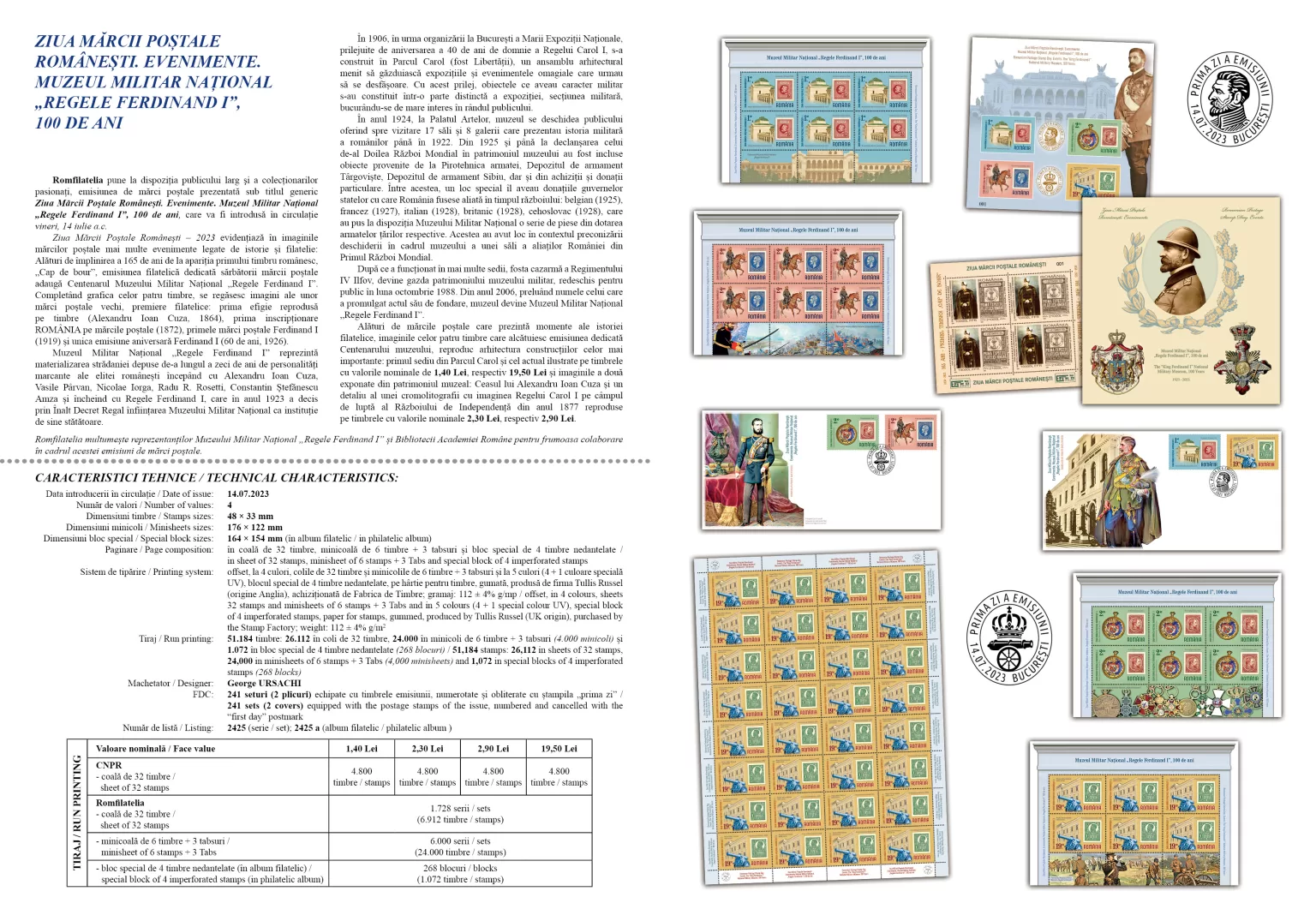 Romfilatelia pune la dispoziţia publicului larg şi a colecţionarilor pasionaţi, emisiunea de mărci poștale prezentată sub titlul generic Ziua Mărcii Poştale Românești. Evenimente. Muzeul Militar Național „Regele Ferdinand I”, 100 de ani, care va fi introdusă în circulaţie vineri, 14 iulie a.c.