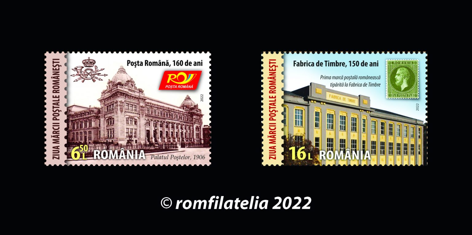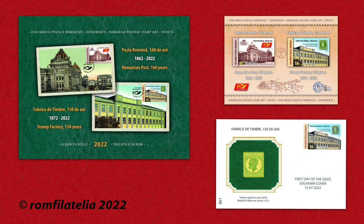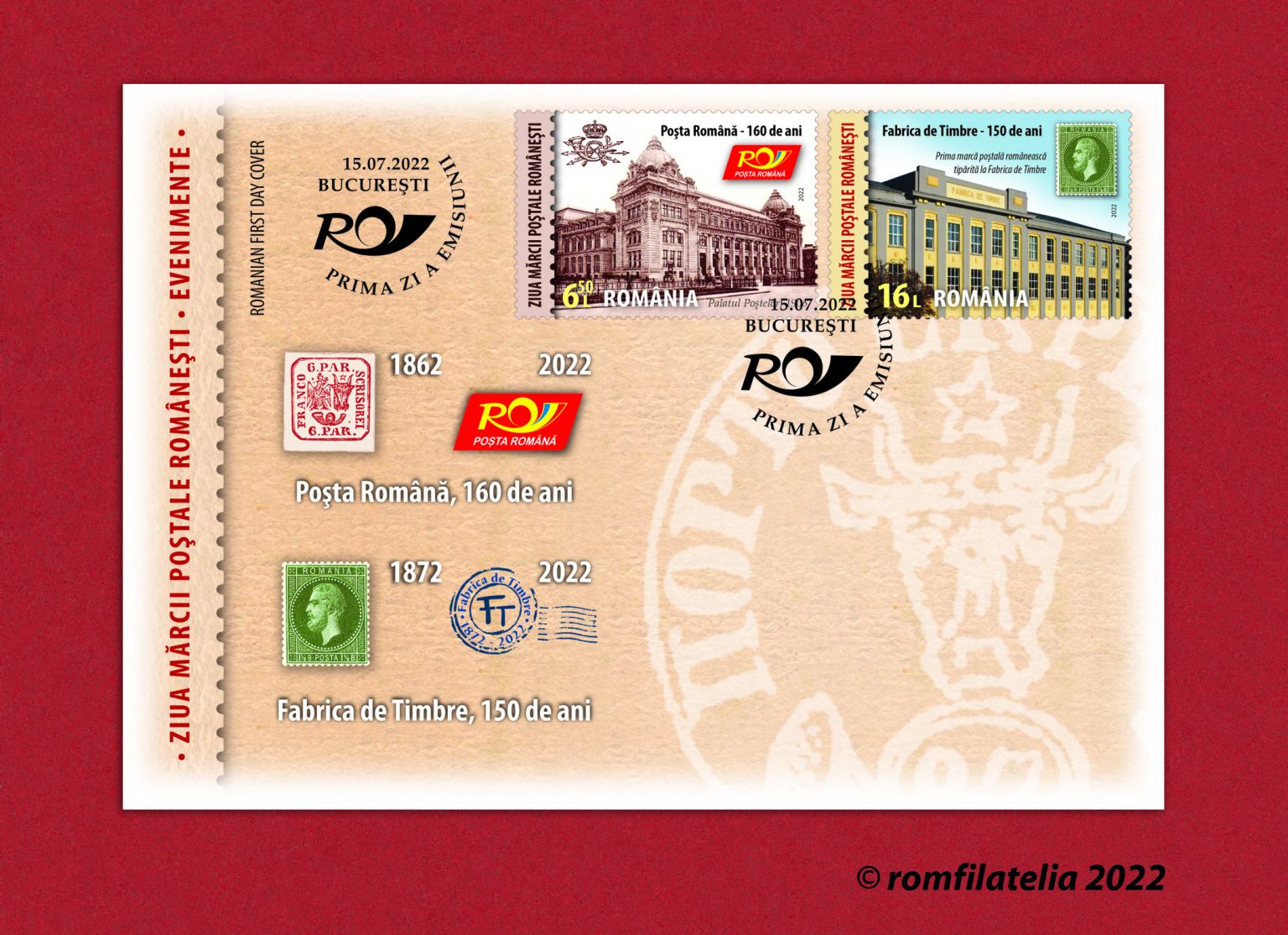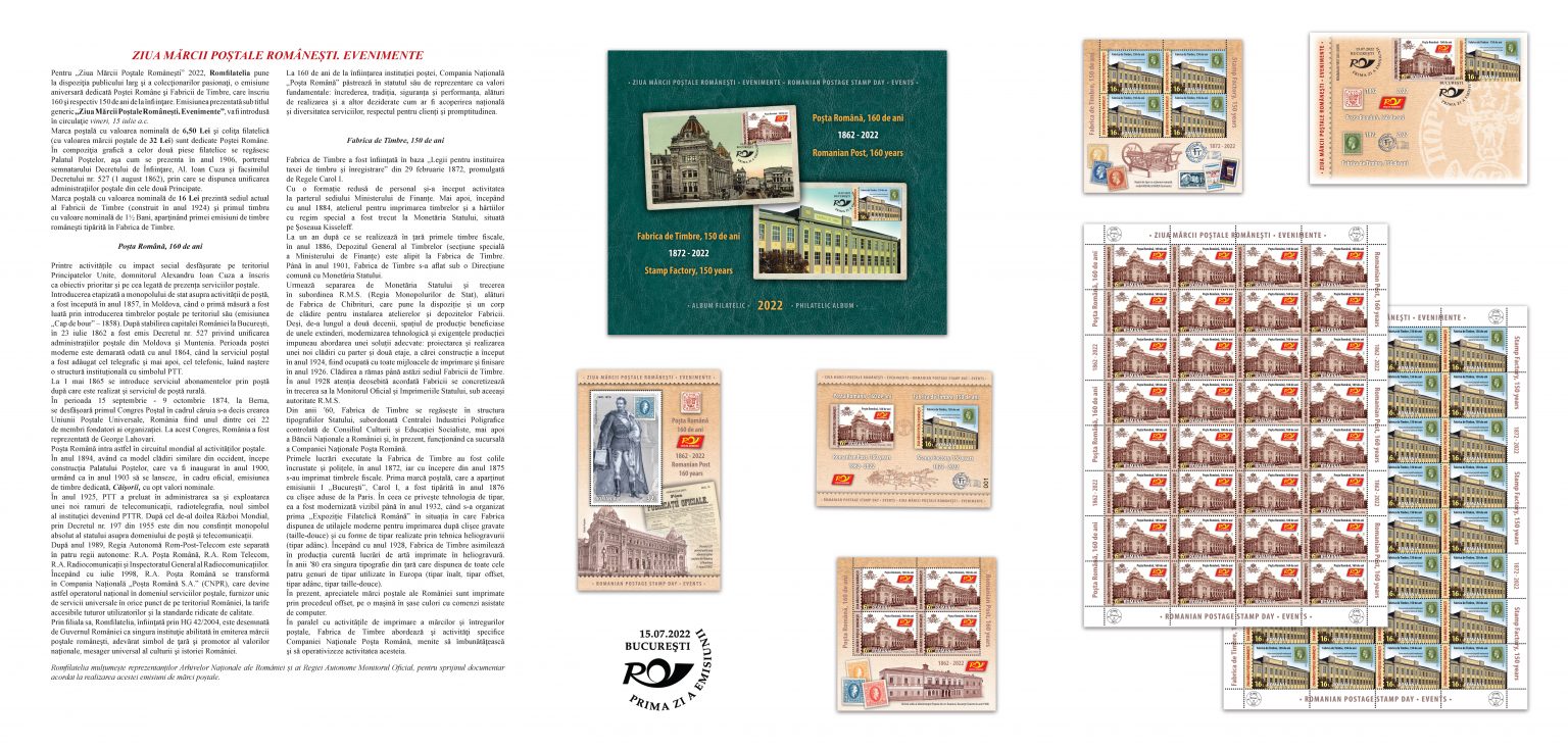 Cu ocazia „Zilei Mărcii Poştale Românești” 2022, Romfilatelia, desemnată de Guvernul României ca singura instituție abilitată în emiterea mărcilor poştale româneşti, pune la dispoziţia publicului larg şi a colecţionarilor pasionaţi, o emisiune aniversară, în premieră filatelică națională, dedicată Poştei Române şi Fabricii de Timbre, care înscriu 160 şi respectiv 150 de ani de la înfiinţare. Emisiunea prezentată sub titlul generic „Ziua Mărcii Poştale Românești. Evenimente”, va fi introdusă în circulaţie, în cadrul ceremoniei de lansare ce va avea loc în Amfiteatrul Ion H. Rădulescu, din incinta Bibliotecii Academiei Române, vineri, 15 iulie a.c.