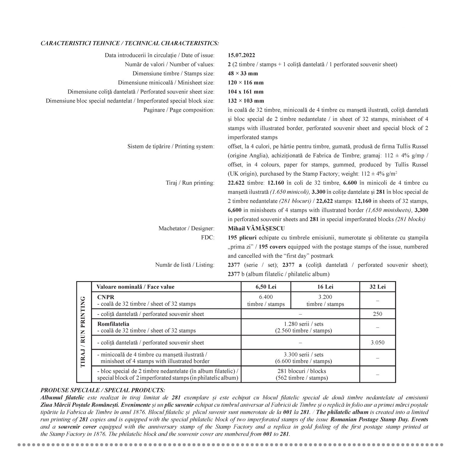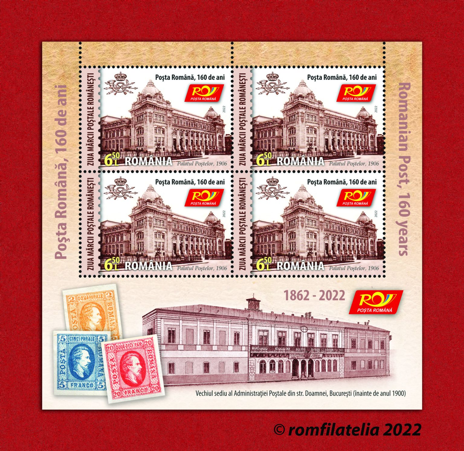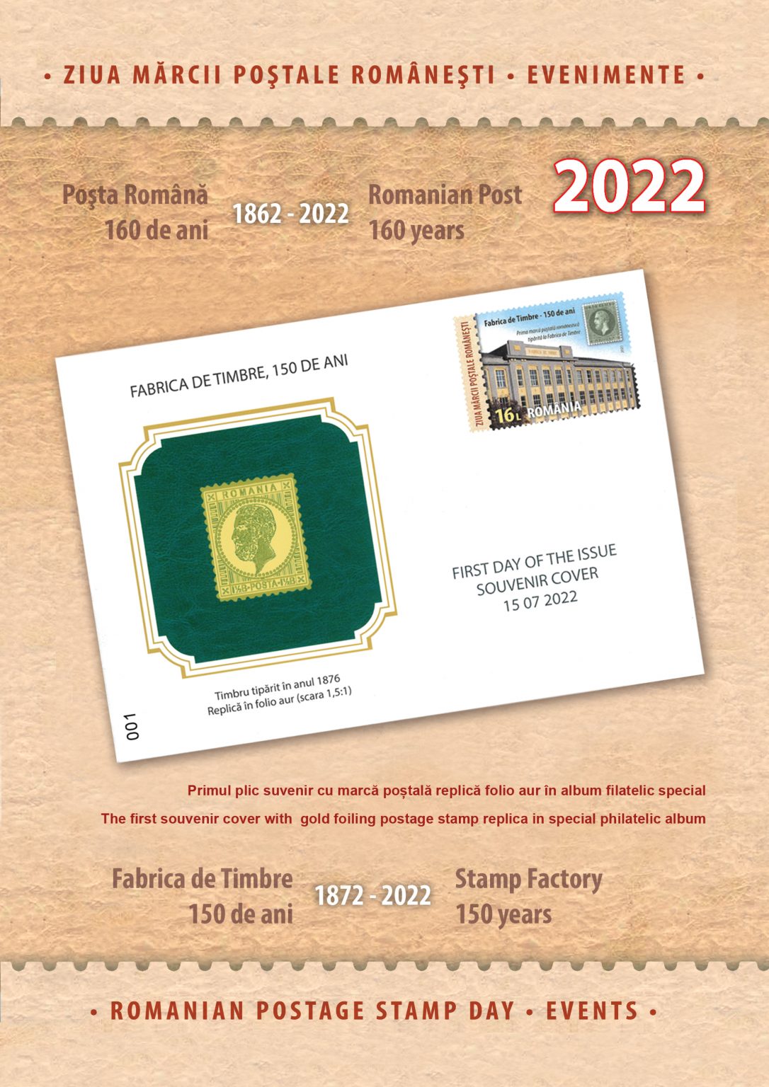 Cu ocazia „Zilei Mărcii Poştale Românești” 2022, Romfilatelia, desemnată de Guvernul României ca singura instituție abilitată în emiterea mărcilor poştale româneşti, pune la dispoziţia publicului larg şi a colecţionarilor pasionaţi, o emisiune aniversară, în premieră filatelică națională, dedicată Poştei Române şi Fabricii de Timbre, care înscriu 160 şi respectiv 150 de ani de la înfiinţare. Emisiunea prezentată sub titlul generic „Ziua Mărcii Poştale Românești. Evenimente”, va fi introdusă în circulaţie, în cadrul ceremoniei de lansare ce va avea loc în Amfiteatrul Ion H. Rădulescu, din incinta Bibliotecii Academiei Române, vineri, 15 iulie a.c.