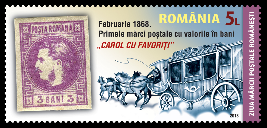 Prima emisiune de mărci poștale românești cunoscută sub denumirea Carol cu favoriţi, cu valoarea nominală exprimată în bani, a fost pusă în circulaţie acum 150 de ani, în anul 1868. Mărcile poștale ale acestei emisiuni fac parte din categoria „litografiate” și au fost tipărite la București, începând cu anul 1864 și până în anul 1872. Procedeul tipografic utilizat (forma de tipar este o piatră specială de calcar cu planeitate perfectă) are unele dezavantaje faţă de tiparul executat cu clișee metalice sau cu clișee gravate: culori mai puţin vii, detalii fine reproduse cu dificultate. Emisiunea amintită marchează momentul introducerii sistemului monetar românesc cu unitatea LEU și diviziunea BAN. De menţionat că mărcile poștale Carol cu favoriţi, cu valoarea în PARALE sau BANI, au fost nedantelate.