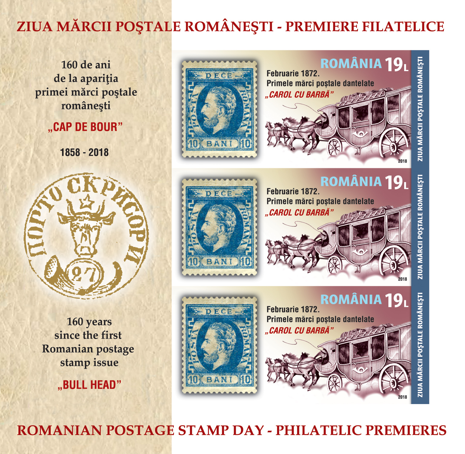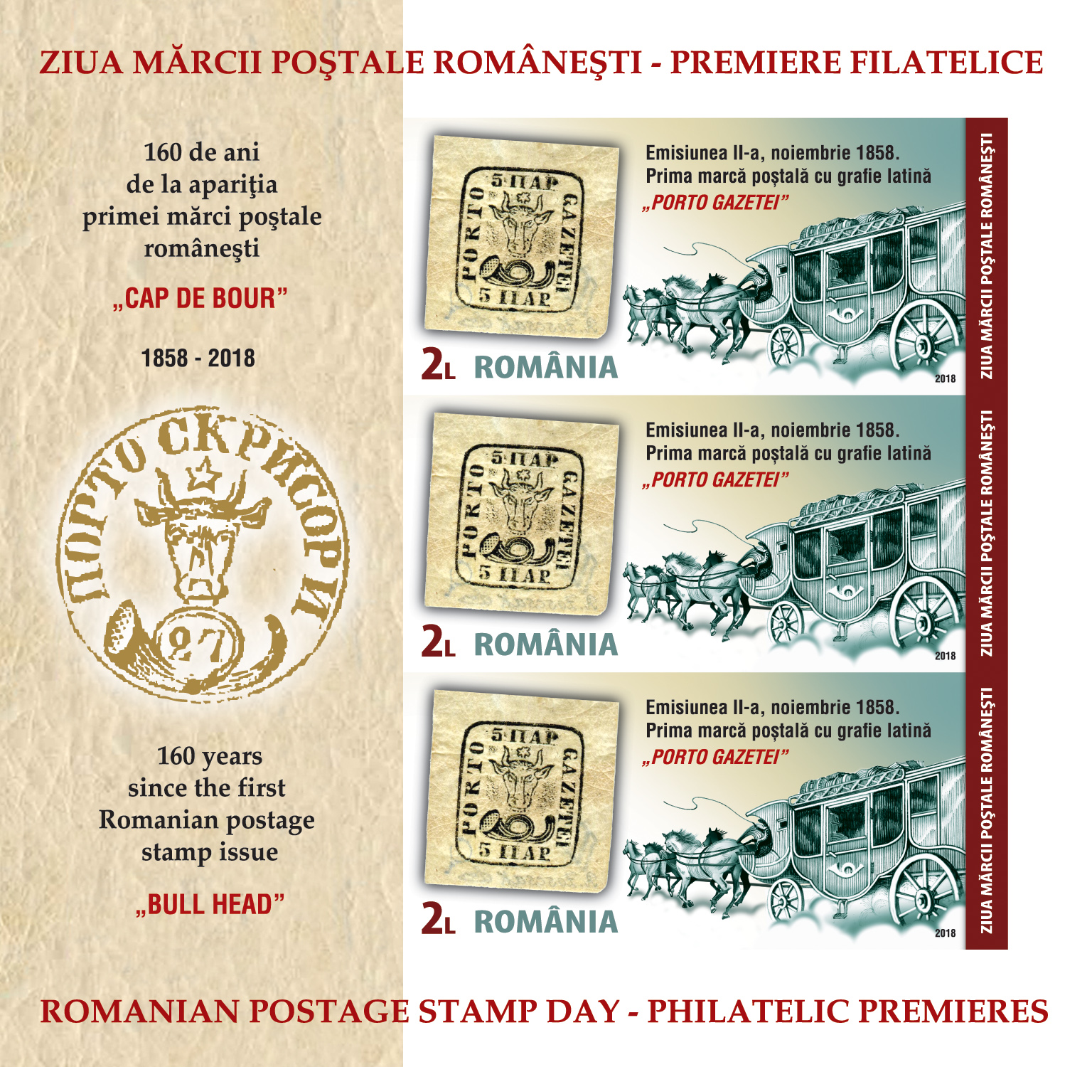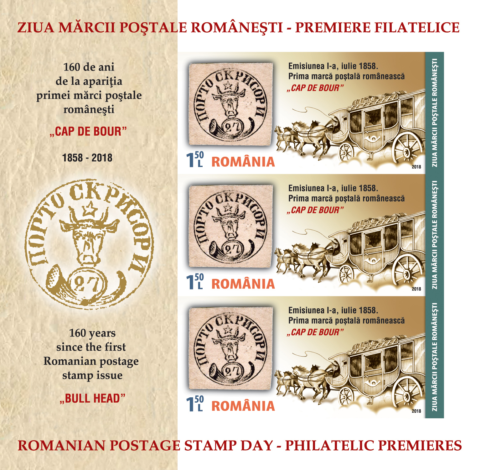 În Anul Centenar al Marii Uniri de la 1918, în contextul aniversării a 160 de ani de la prima emisiune de timbre românești, cunoscută în lista tematicilor sub denumirea de Cap de bour, la care se adaugă alte premiere legate de modul de realizare și prezentare a timbrelor, Romfilatelia introduce în circulaţie emisiunea de mărci poștale Ziua Mărcii Poștale Românești – Premiere filatelice.