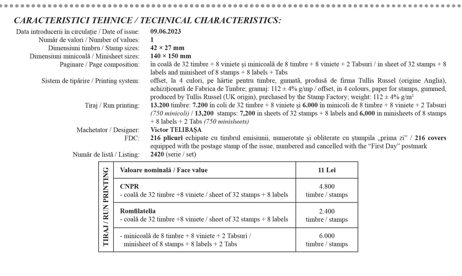 Emisiunea va fi disponibilă de Vineri, 09 iunie, în rețeaua magazinelor Romfilatelia din București, Bacău, Brașov, Cluj-Napoca, Iași, Timișoara, precum și în magazinul nostru online: https://romfilatelia.ro/store/.
