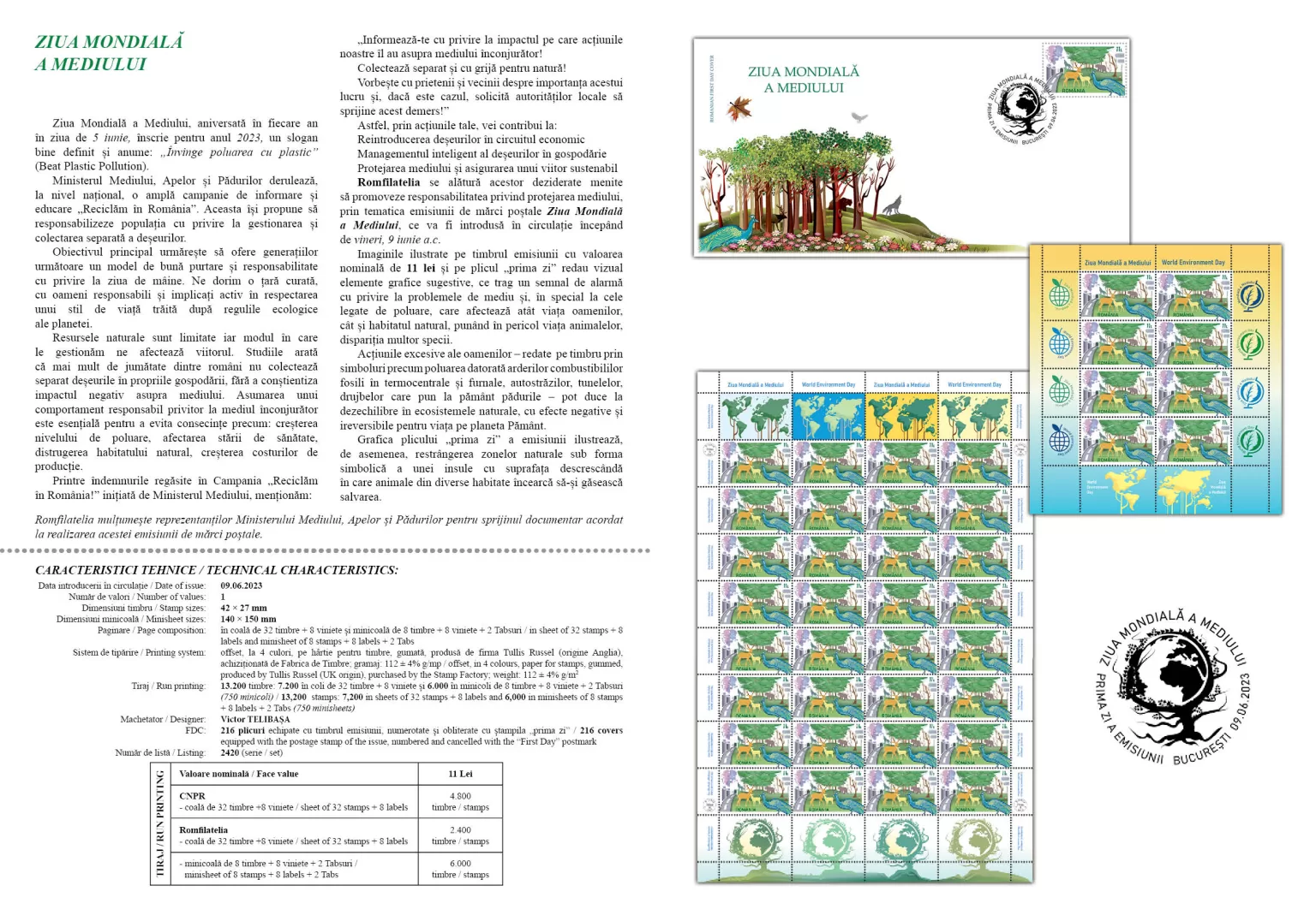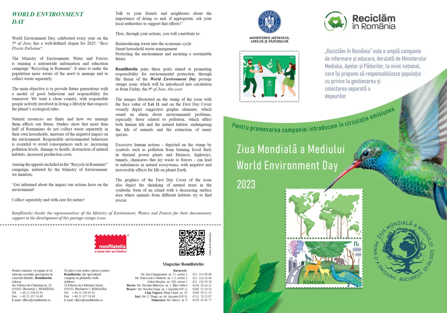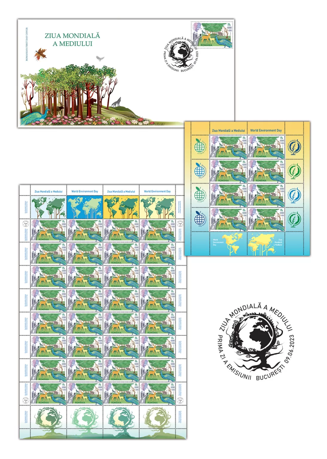 Romfilatelia se alătură acestor deziderate menite să promoveze responsabilitatea privind protejarea mediului, prin tematica emisiunii de mărci poștale Ziua Mondială a Mediului, ce va fi introdusă în circulație începând de vineri, 9 iunie a.c.