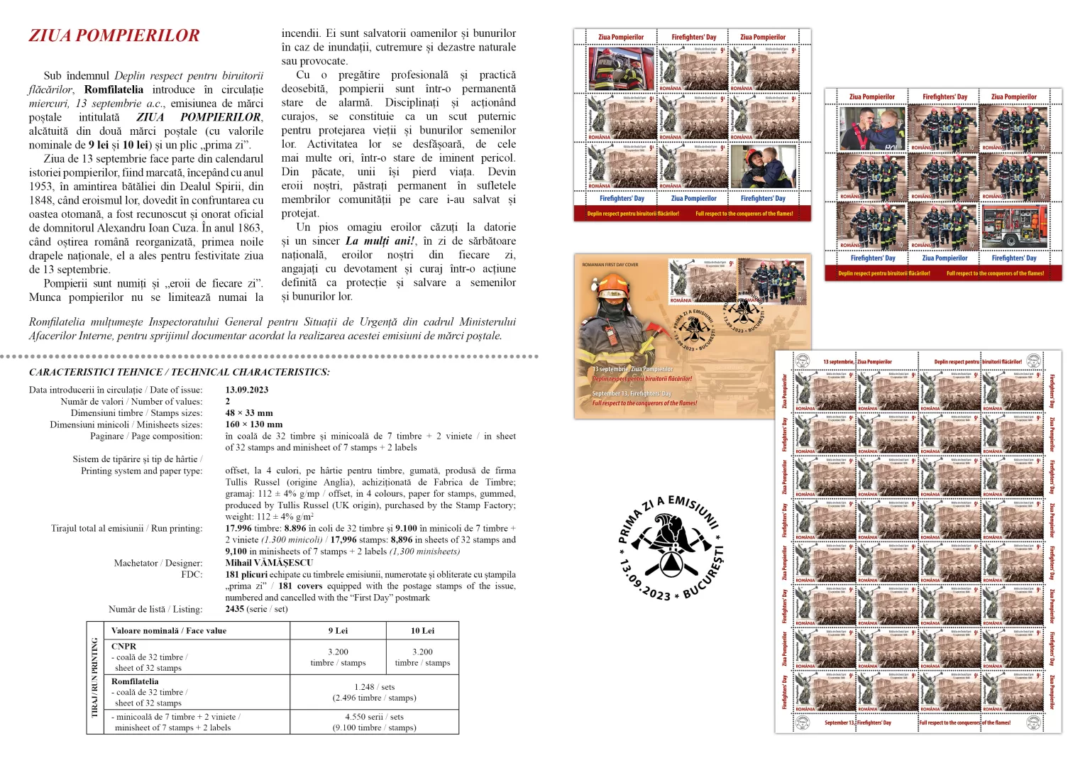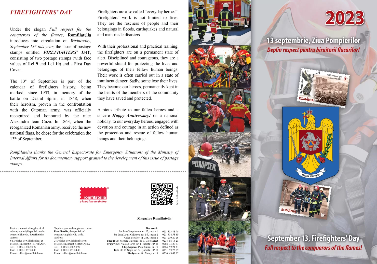 Sub îndemnul Deplin respect pentru biruitorii flăcărilor, Romfilatelia introduce în circulație miercuri, 13 septembrie a.c., emisiunea de mărci poștale intitulată ZIUA POMPIERILOR, alcătuită din două mărci poștale (cu valorile nominale de 9 lei și 10 lei) și un plic „prima zi”.