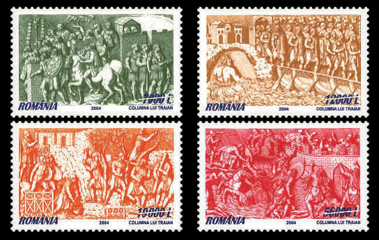 Romfilatelia, societate specializată în emiterea și comercializarea mărcilorTimbrul cu valoarea nominală de 31.000 lei ilustrează cucerirea unor cetăți dacice după lupta de la Tapae, precum și traversarea unui râu de munte de către armatele romane.