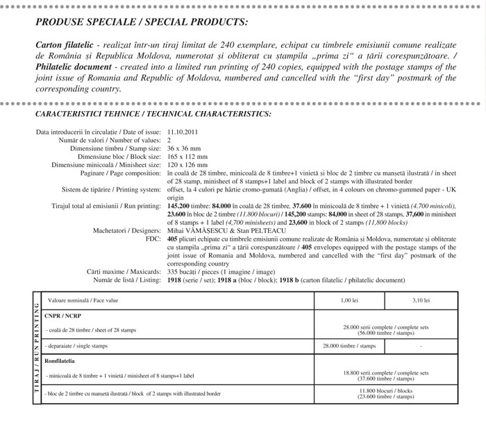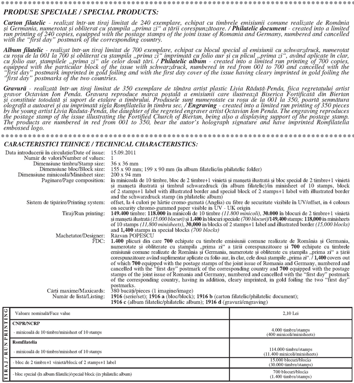 Trebuie menţionat faptul cã grafica comunã a timbrelor celor douã ţãri a fost realizatã de graficianul român Rãzvan Popescu, desemnat câştigãtor în urma unui concurs de machetare desfãşurat în 2010, la Berlin şi organizat de Ministerul de Finanţe al Republicii Federale Germania şi Romfilatelia.