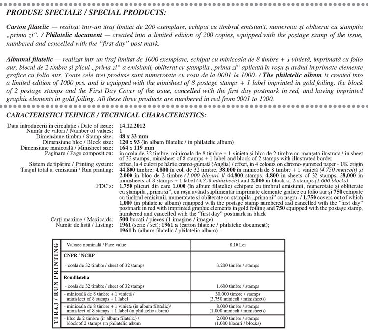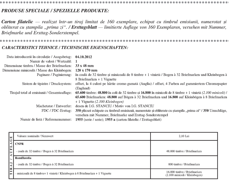 Apariţia acestei noi emisiuni de mărci poştale confirmă încă o dată bunele relaţii, devenite deja o tradiţie, statornicite între Romfilatelia şi partenerul german, în domeniul filatelic.