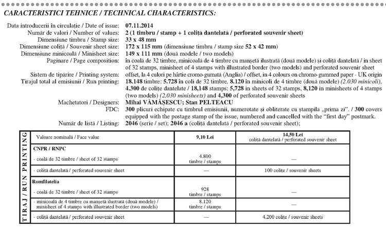 Romfilatelia mulţumeşte Muzeului Judeţean Aurelian Sacerdoţeanu, Vâlcea, pentru sprijinul documentar şi fotografic acordat în realizarea acestei emisiuni de mărci poştale.