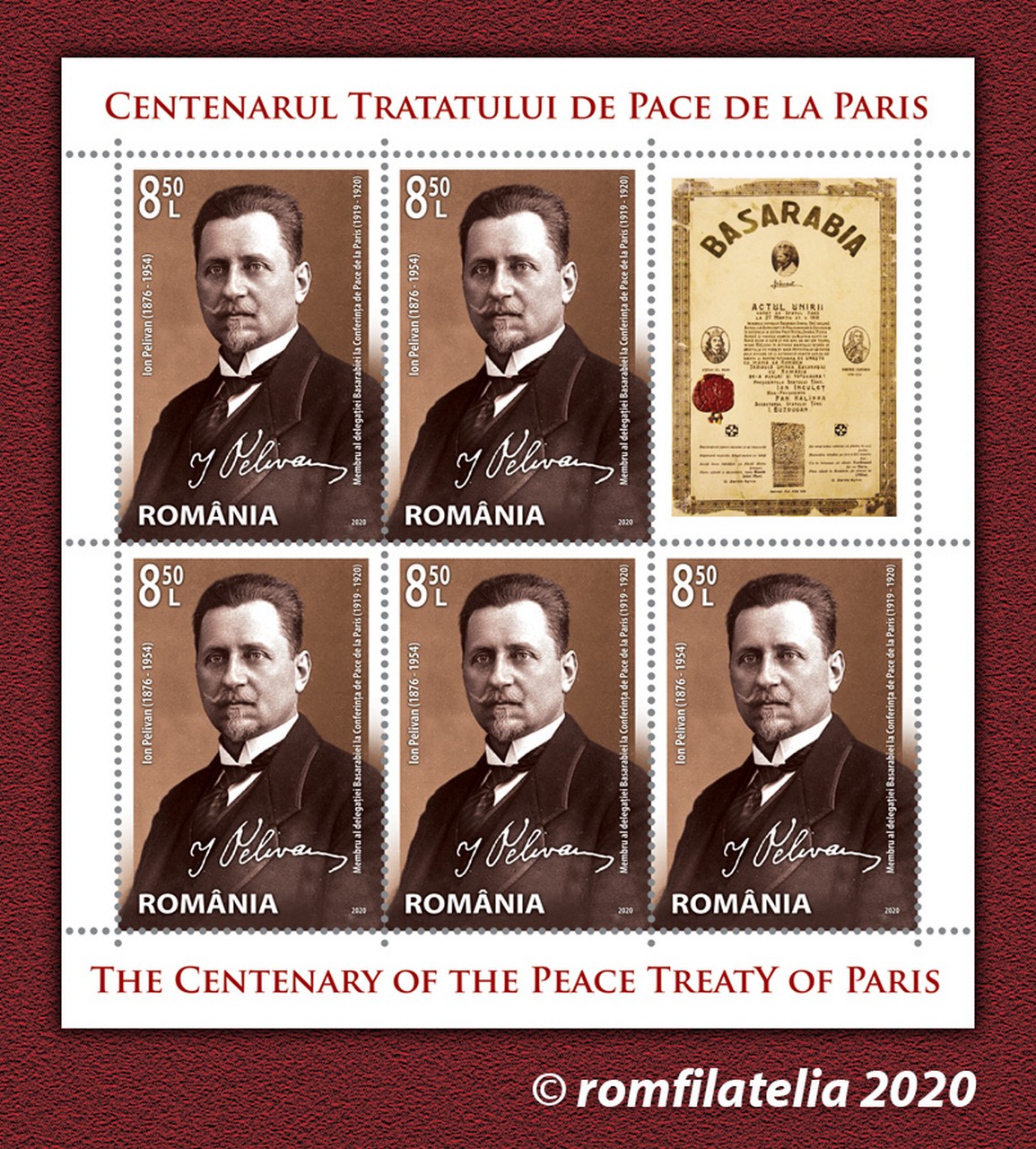 reproduce portretul șefului delegației Basarabiei la Conferința de Pace de la Paris, Ion Pelivan, iar timbrul coliței nedantelate, cu valoare nominală de 29 lei, reproduce portretul lui Take Ionescu, în ansamblu grafic cu Actul Unirii Basarabiei cu România, datat 27 martie 1918.