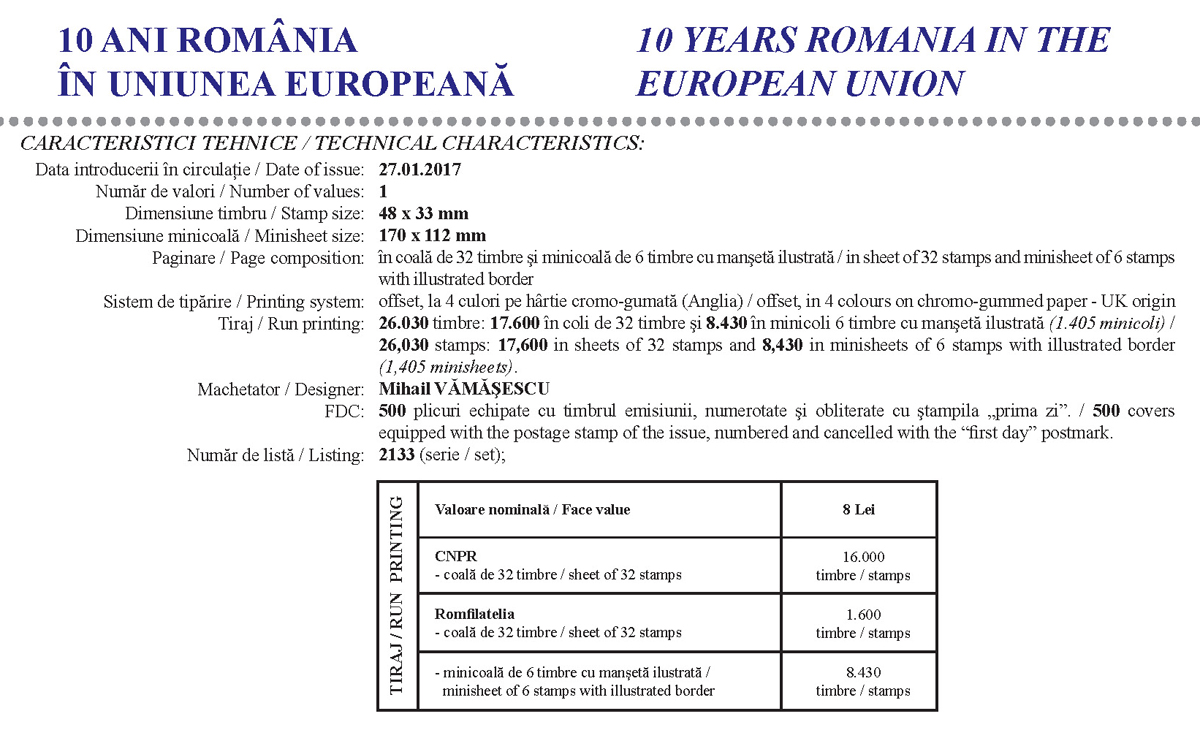 În 2017 Romfilatelia marchează împlinirea a 10 ani de la intrarea României în Uniunea Europeană, la 1 ianuarie 2007, un moment de referinţă înscris în istoria României contemporane.
