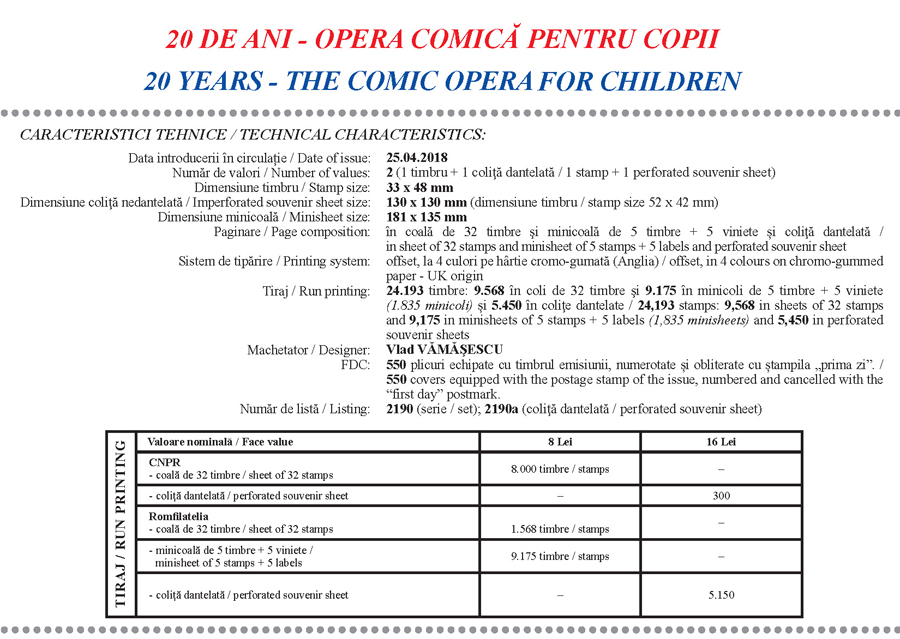 Cu ocazia aniversării a două decenii de activitate dedicată promovării culturii şi valorilor naţionale în rândul copiilor, Romfilatelia introduce în circulaţie emisiunea de mărci poştale 20 de ani – Opera Comică pentru Copii.